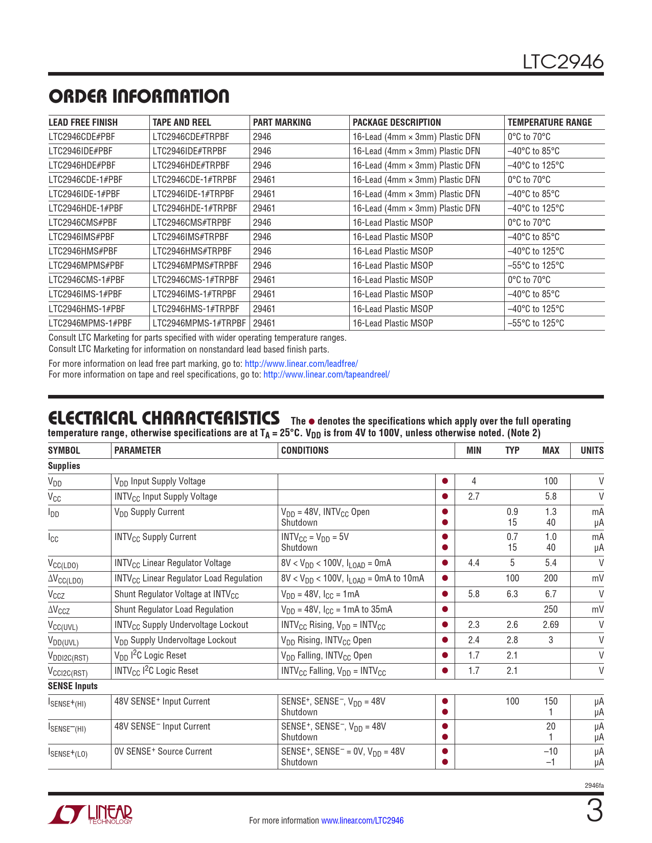 LTC2946 ORDER INFORMATION LEAD FREE FINISHTAPE AND REELPART MARKINGPACKAGE DESCRIPTIONTEMPERATURE RANGE LTC2946CDE#PBF LTC2946CDE#TRPBF 2946 16-Lead (4mm × 3mm) Plastic DFN 0°C to 70°C LTC2946IDE#PBF LTC2946IDE#TRPBF 2946 16-Lead (4mm × 3mm) Plastic DFN –40°C to 85°C LTC2946HDE#PBF LTC2946HDE#TRPBF 2946 16-Lead (4mm × 3mm) Plastic DFN –40°C to 125°C LTC2946CDE-1#PBF LTC2946CDE-1#TRPBF 29461 16-Lead (4mm × 3mm) Plastic DFN 0°C to 70°C LTC2946IDE-1#PBF LTC2946IDE-1#TRPBF 29461 16-Lead (4mm × 3mm) Plastic DFN –40°C to 85°C LTC2946HDE-1#PBF LTC2946HDE-1#TRPBF 29461 16-Lead (4mm × 3mm) Plastic DFN –40°C to 125°C LTC2946CMS#PBF LTC2946CMS#TRPBF 2946 16-Lead Plastic MSOP 0°C to 70°C LTC2946IMS#PBF LTC2946IMS#TRPBF 2946 16-Lead Plastic MSOP –40°C to 85°C LTC2946HMS#PBF LTC2946HMS#TRPBF 2946 16-Lead Plastic MSOP –40°C to 125°C LTC2946MPMS#PBF LTC2946MPMS#TRPBF 2946 16-Lead Plastic MSOP –55°C to 125°C LTC2946CMS-1#PBF LTC2946CMS-1#TRPBF 29461 16-Lead Plastic MSOP 0°C to 70°C LTC2946IMS-1#PBF LTC2946IMS-1#TRPBF 29461 16-Lead Plastic MSOP –40°C to 85°C LTC2946HMS-1#PBF LTC2946HMS-1#TRPBF 29461 16-Lead Plastic MSOP –40°C to 125°C LTC2946MPMS-1#PBF LTC2946MPMS-1#TRPBF 29461 16-Lead Plastic MSOP –55°C to 125°C Consult LTC Marketing for parts specified with wider operating temperature ranges. Consult LTC Marketing for information on nonstandard lead based finish parts. For more information on lead free part marking, go to: http://www.linear.com/leadfree/ For more information on tape and reel specifications, go to: http://www.linear.com/tapeandreel/ ELECTRICALCHARACTERISTICS The l denotes the specifications which apply over the full operatingtemperature range, otherwise specifications are at TA = 25°C. VDD is from 4V to 100V, unless otherwise noted. (Note 2) SYMBOLPARAMETERCONDITIONSMINTYPMAXUNITSSupplies VDD VDD Input Supply Voltage l 4 100 V VCC INTVCC Input Supply Voltage l 2.7 5.8 V IDD VDD Supply Current VDD = 48V, INTVCC Open l 0.9 1.3 mA Shutdown l 15 40 μA ICC INTVCC Supply Current INTVCC = VDD = 5V l 0.7 1.0 mA Shutdown l 15 40 μA VCC(LDO) INTVCC Linear Regulator Voltage 8V < VDD < 100V, ILOAD = 0mA l 4.4 5 5.4 V ΔVCC(LDO) INTVCC Linear Regulator Load Regulation 8V < VDD < 100V, ILOAD = 0mA to 10mA l 100 200 mV VCCZ Shunt Regulator Voltage at INTVCC VDD = 48V, ICC = 1mA l 5.8 6.3 6.7 V ΔVCCZ Shunt Regulator Load Regulation VDD = 48V, ICC = 1mA to 35mA l 250 mV VCC(UVL) INTVCC Supply Undervoltage Lockout INTVCC Rising, VDD = INTVCC l 2.3 2.6 2.69 V VDD(UVL) VDD Supply Undervoltage Lockout VDD Rising, INTVCC Open l 2.4 2.8 3 V VDDI2C(RST) VDD I2C Logic Reset VDD Falling, INTVCC Open l 1.7 2.1 V VCCI2C(RST) INTVCC I2C Logic Reset INTVCC Falling, VDD = INTVCC l 1.7 2.1 V SENSE Inputs ISENSE+(HI) 48V SENSE+ Input Current SENSE+, SENSE–, VDD = 48V l 100 150 µA Shutdown l 1 µA ISENSE–(HI) 48V SENSE– Input Current SENSE+, SENSE–, VDD = 48V l 20 µA Shutdown l 1 µA ISENSE+(LO) 0V SENSE+ Source Current SENSE+, SENSE– = 0V, VDD = 48V l –10 µA Shutdown l –1 µA 2946fa For more information www.linear.com/LTC2946 3 Document Outline Features Applications Description Typical Application Absolute Maximum Ratings Pin Configuration Order Information Electrical Characteristics Typical Performance Characteristics Pin Functions Block Diagram Timing Diagram Operation Applications Information Typical Applications Package Description Typical Application Related Parts