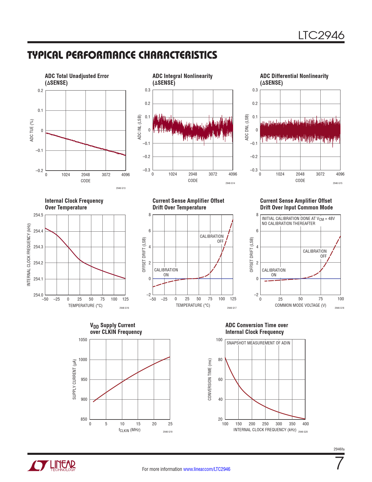 254.5 8 8 INITIAL CALIBRATION DONE AT VCM = 48V NO CALIBRATION THEREAFTER 254.4 6 6 CALIBRATION OFF 254.3 T (LSB) 4 T (LSB) 4 CALIBRATION OFF 254.2 2 2 OFFSET DRIF CALIBRATION OFFSET DRIF CALIBRATION ON ON 254.1 0 0 INTERNAL CLOCK FREQUENCY (kHz) 254.0 –2 –2 –50 –25 0 25 50 75 100 125 –50 –25 0 25 50 75 100 125 0 25 50 75 100 TEMPERATURE (°C) TEMPERATURE (°C) COMMON MODE VOLTAGE (V) 2946 G16 2946 G17 2946 G18