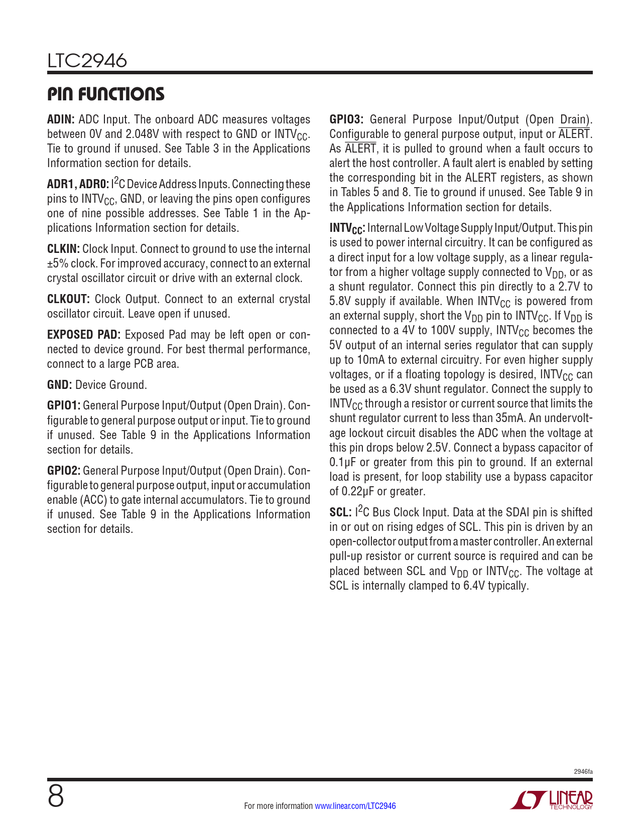 I2C Bus Clock Input. Data at the SDAI pin is shifted section for details. in or out on rising edges of SCL. This pin is driven by an open-collector output from a master controller. An external pull-up resistor or current source is required and can be placed between SCL and VDD or INTVCC. The voltage at SCL is internally clamped to 6.4V typically. 2946fa 8 For more information www.linear.com/LTC2946 Document Outline Features Applications Description Typical Application Absolute Maximum Ratings Pin Configuration Order Information Electrical Characteristics Typical Performance Characteristics Pin Functions Block Diagram Timing Diagram Operation Applications Information Typical Applications Package Description Typical Application Related Parts
