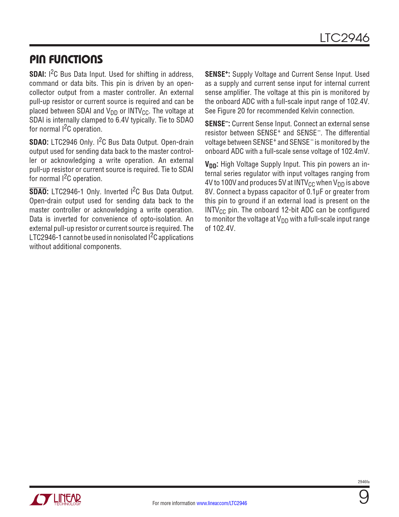 LTC2946 PIN FUNCTIONSSDAI: I2C Bus Data Input. Used for shifting in address, SENSE+: Supply Voltage and Current Sense Input. Used command or data bits. This pin is driven by an open- as a supply and current sense input for internal current collector output from a master controller. An external sense amplifier. The voltage at this pin is monitored by pull-up resistor or current source is required and can be the onboard ADC with a full-scale input range of 102.4V. placed between SDAI and VDD or INTVCC. The voltage at See Figure 20 for recommended Kelvin connection. SDAI is internally clamped to 6.4V typically. Tie to SDAO SENSE–: Current Sense Input. Connect an external sense for normal I2C operation. resistor between SENSE+ and SENSE–. The differential SDAO: LTC2946 Only. I2C Bus Data Output. Open-drain voltage between SENSE+ and SENSE– is monitored by the output used for sending data back to the master control- onboard ADC with a full-scale sense voltage of 102.4mV. ler or acknowledging a write operation. An external V pull-up resistor or current source is required. Tie to SDAI DD: High Voltage Supply Input. This pin powers an in- ternal series regulator with input voltages ranging from for normal I2C operation. 4V to 100V and produces 5V at INTVCC when VDD is above SDAO: LTC2946-1 Only. Inverted I2C Bus Data Output. 8V. Connect a bypass capacitor of 0.1μF or greater from Open-drain output used for sending data back to the this pin to ground if an external load is present on the master controller or acknowledging a write operation. INTVCC pin. The onboard 12-bit ADC can be configured Data is inverted for convenience of opto-isolation. An to monitor the voltage at VDD with a full-scale input range external pull-up resistor or current source is required. The of 102.4V. LTC2946-1 cannot be used in nonisolated I2C applications without additional components. 2946fa For more information www.linear.com/LTC2946 9 Document Outline Features Applications Description Typical Application Absolute Maximum Ratings Pin Configuration Order Information Electrical Characteristics Typical Performance Characteristics Pin Functions Block Diagram Timing Diagram Operation Applications Information Typical Applications Package Description Typical Application Related Parts
