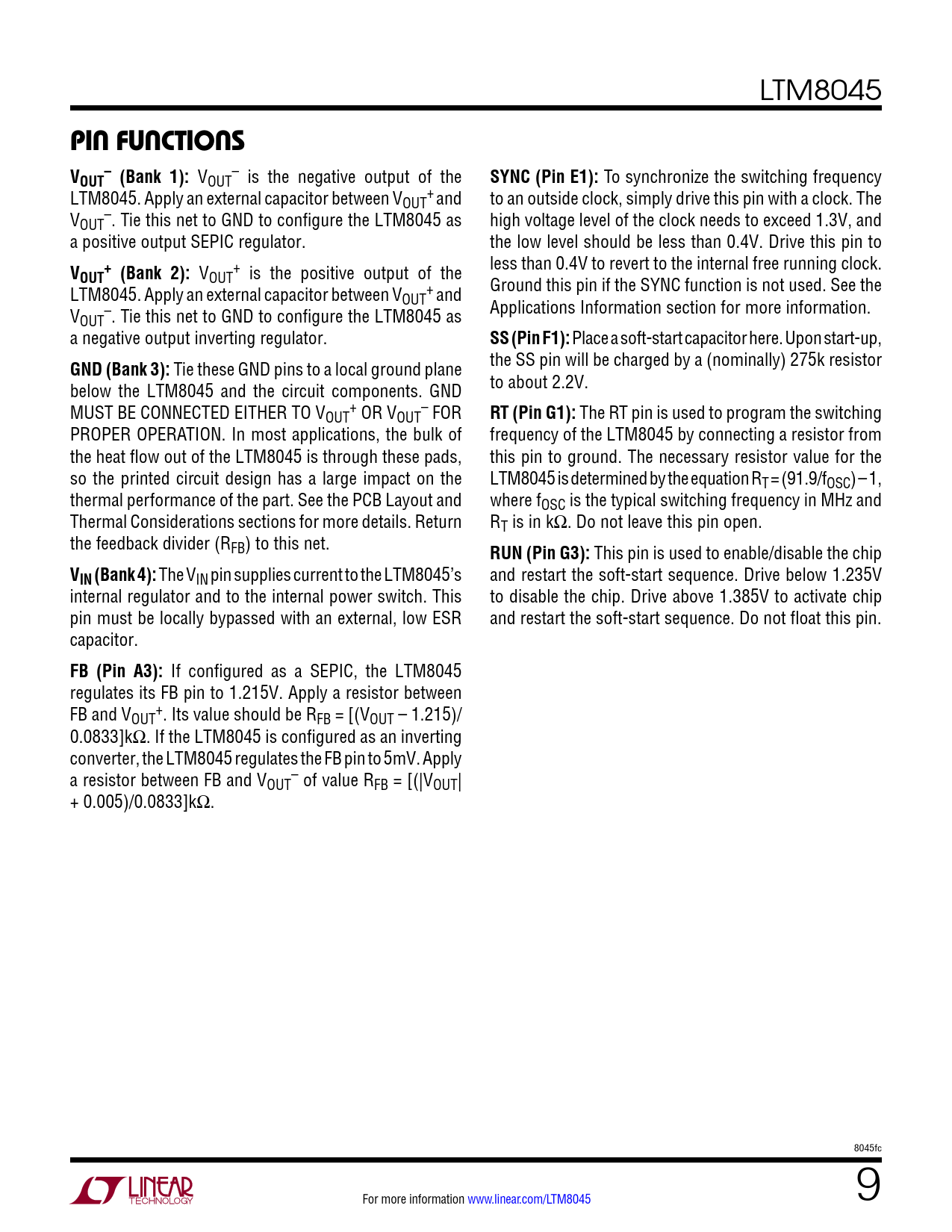 VOUT is the positive output of the LTM8045. Apply an external capacitor between V + Ground this pin if the SYNC function is not used. See the OUT and V – Applications Information section for more information. OUT . Tie this net to GND to configure the LTM8045 as a negative output inverting regulator.