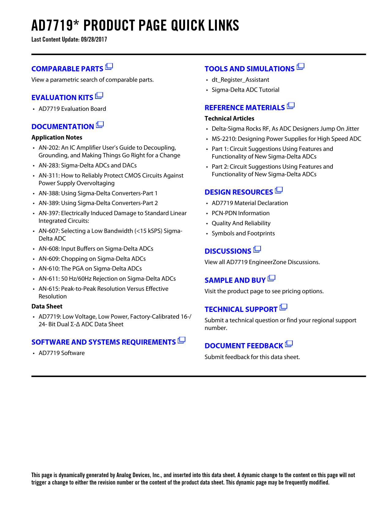AD7719* PRODUCT PAGE QUICK LINKS Last Content Update: 09/28/2017COMPARABLE PARTSTOOLS AND SIMULATIONS View a parametric search of comparable parts. • dt_Register_Assistant • Sigma-Delta ADC Tutorial EVALUATION KITS • AD7719 Evaluation Board REFERENCE MATERIALSTechnical ArticlesDOCUMENTATION • Delta-Sigma Rocks RF, As ADC Designers Jump On Jitter Application Notes • MS-2210: Designing Power Supplies for High Speed ADC • AN-202: An IC Amplifier User’s Guide to Decoupling, • Part 1: Circuit Suggestions Using Features and Grounding, and Making Things Go Right for a Change Functionality of New Sigma-Delta ADCs • AN-283: Sigma-Delta ADCs and DACs • Part 2: Circuit Suggestions Using Features and • AN-311: How to Reliably Protect CMOS Circuits Against Functionality of New Sigma-Delta ADCs Power Supply Overvoltaging • AN-388: Using Sigma-Delta Converters-Part 1 DESIGN RESOURCES • AN-389: Using Sigma-Delta Converters-Part 2 • AD7719 Material Declaration • AN-397: Electrically Induced Damage to Standard Linear • PCN-PDN Information Integrated Circuits: • Quality And Reliability • AN-607: Selecting a Low Bandwidth (<15 kSPS) Sigma- • Symbols and Footprints Delta ADC • AN-608: Input Buffers on Sigma-Delta ADCs DISCUSSIONS • AN-609: Chopping on Sigma-Delta ADCs View all AD7719 EngineerZone Discussions. • AN-610: The PGA on Sigma-Delta ADCs • AN-611: 50 Hz/60Hz Rejection on Sigma-Delta ADCs SAMPLE AND BUY • AN-615: Peak-to-Peak Resolution Versus Effective Visit the product page to see pricing options. Resolution Data SheetTECHNICAL SUPPORT • AD7719: Low Voltage, Low Power, Factory-Calibrated 16-/ Submit a technical question or find your regional support 24- Bit Dual Σ-Δ ADC Data Sheet number. SOFTWARE AND SYSTEMS REQUIREMENTSDOCUMENT FEEDBACK • AD7719 Software Submit feedback for this data sheet. This page is dynamically generated by Analog Devices, Inc., and inserted into this data sheet. A dynamic change to the content on this page will not trigger a change to either the revision number or the content of the product data sheet. This dynamic page may be frequently modified. Document Outline FEATURES APPLICATIONS GENERAL DESCRIPTION FUNCTIONAL BLOCK DIAGRAM TABLE OF CONTENTS SPECIFICATIONS ABSOLUTE MAXIMUM RATINGS ORDERING GUIDE TIMING CHARACTERISTICS DIGITAL INTERFACE PIN CONFIGURATION PIN FUNCTION DESCRIPTIONS Typical Performance Characteristics DUAL-CHANNEL ADC CIRCUIT INFORMATION Overview Main Channel Auxiliary Channel Both Channels MAIN AND AUXILIARY ADC NOISE PERFORMANCE ON-CHIP REGISTERS Communications Register (A3, A2, A1, A0 = 0, 0, 2, 0) Status Register (A3, A2, A1, A0 = 0, 0, 0, 0; Power-On Reset = 0x00) Mode Register (A3, A2, A1, A0 = 0, 0, 0, 1; Power-On Reset = 0x00) Operating Characteristics when Addressing the Mode and Control Registers Main ADC Control Register (AD0CON): (A3, A2, A1, A0 = 0, 0, 1, 0; Power-On Reset = 0x07) Aux ADC Control Registers (AD1CON): (A3, A2, A1, A0 = 0, 0, 1, 1; Power-On Reset = 0x00) Filter Register (A3, A2, A1, A0 = 0, 1, 0, 0; Power-On Reset = 0x45) I/O and Current Source Control Register (IOCON): (A3, A2, A1, A0 = 0, 1, 1, 1; Power-On Reset = 0x0000) Main ADC Data Result Registers (DATA0): (A3, A2, A1, A0 = 0, 1, 0, 1; Power-On Reset = 0x00 0000) Aux ADC Data Result Registers (DATA1): (A3, A2, A1, A0 = 0, 1, 1, 0; Power-On Reset = 0x0000) Main ADC Offset Calibration Coefficient Registers (OF0): (A3, A2, A1, A0 = 1, 0, 0, 0; Power-On Reset = 0x80 0000) Aux ADC Offset Calibration Coefficient Registers (OF1): (A3, A2, A1, A0 = 1, 0, 0, 1; Power-On Reset = 0x8000) Main ADC Gain Calibration Coefficient Registers (GNO): (A3, A2, A1, A0 = 1, 0, 1, 0; Power-On Reset = 0x5X XXX5) Aux ADC Gain Calibration Coefficient Registers (GN1): (A3, A2, A1, A0 = 1, 0, 1, 1; Power-On Reset = 0x59XX) ID Register (ID): (A3, A2, A1, A0 = 1, 1, 1, 1; Power-On Reset = 0x0X) User Nonprogrammable Test Registers CONFIGURING THE AD7719 MICROCOMPUTER/MICROPROCESSOR INTERFACING AD7719-to-68HC11 Interface AD7719-to-8xC51 Interface AD7719-to-ADSP-2103/ADSP-2105 Interface CIRCUIT DESCRIPTION Analog Input Channels Programmable Gain Amplifier Bipolar/Unipolar Configuration Data Output Coding Burnout Currents Excitation Currents Crystal Oscillator Reference Input Reference Detect Reset Input Power-Down Mode Idle Mode ADC Disable Mode Calibration Grounding and Layout APPLICATIONS Pressure Measurement Temperature Measurement 3-Wire RTD Configurations Smart Transmitters OUTLINE DIMENSIONS Revision History