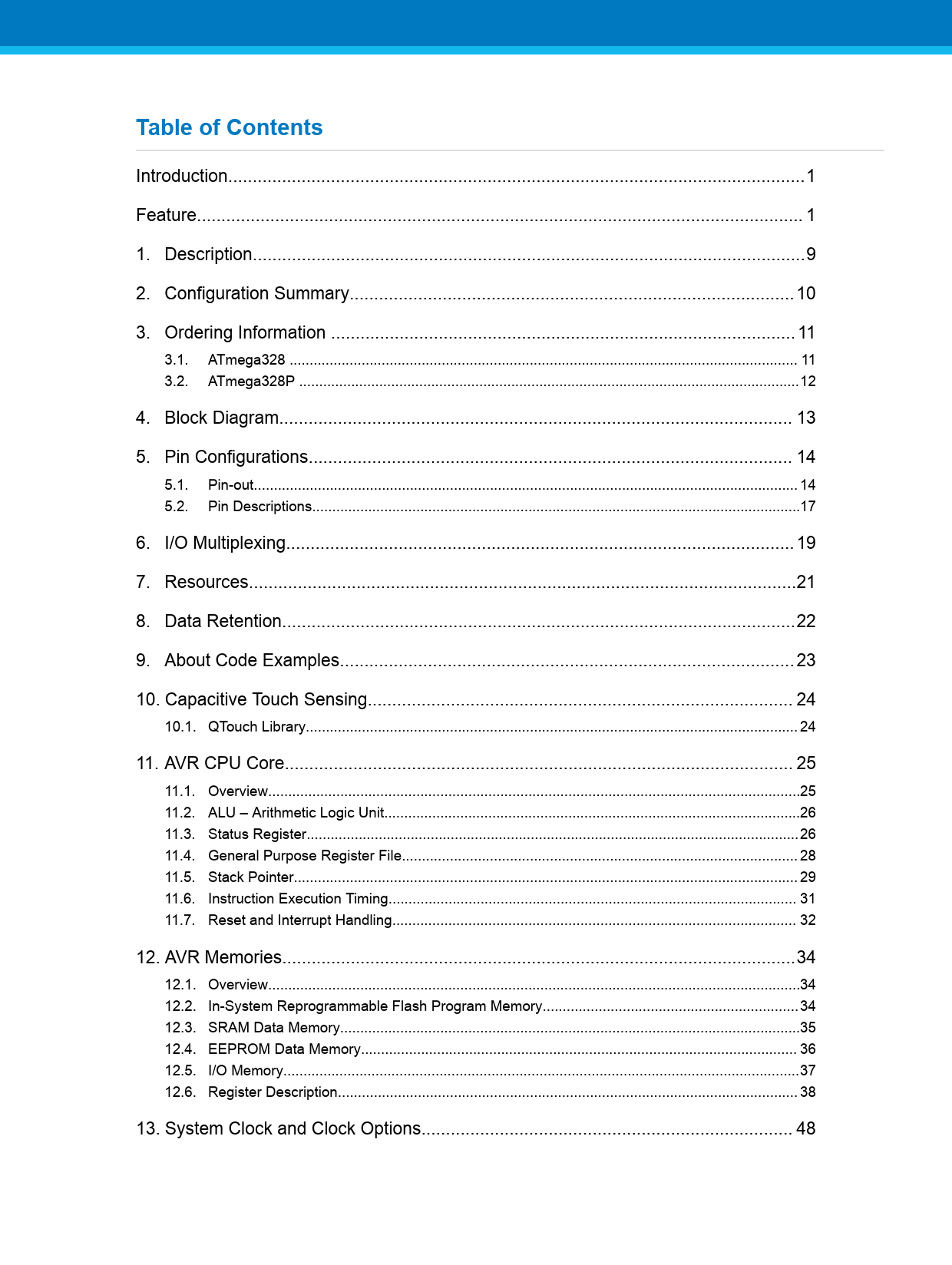 Introduction..1 Feature.. 1 1. Description...9 2. Configuration Summary... 10 3. Ordering Information ... 11 3.1. ATmega328 ... 11 3.2. ATmega328P ...12 4. Block Diagram... 13 5. Pin Configurations... 14 5.1. Pin-out.. 14 5.2. Pin Descriptions..17 6. I/O Multiplexing.. 19 7. Resources..21 8. Data Retention...22 9. About Code Examples... 23 10. Capacitive Touch Sensing... 24 10.1. QTouch Library... 24 11. AVR CPU Core.. 25 11.1. Overview...25 11.2. ALU – Arithmetic Logic Unit..26 11.3. Status Register...26 11.4. General Purpose Register File... 28 11.5. Stack Pointer.. 29 11.6. Instruction Execution Timing.. 31 11.7. Reset and Interrupt Handling... 32 12. AVR Memories...34 12.1. Overview...34 12.2. In-System Reprogrammable Flash Program Memory..34 12.3. SRAM Data Memory...35 12.4. EEPROM Data Memory... 36 12.5. I/O Memory...37 12.6. Register Description... 38 13. System Clock and Clock Options.. 48 Document Outline Introduction Feature Table of Contents 1. Description 2. Configuration Summary 3. Ordering Information 3.1. ATmega328 3.2. ATmega328P 4. Block Diagram 5. Pin Configurations 5.1. Pin-out 5.2. Pin Descriptions 5.2.1. VCC 5.2.2. GND 5.2.3. Port B (PB[7:0]) XTAL1/XTAL2/TOSC1/TOSC2 5.2.4. Port C (PC[5:0]) 5.2.5. PC6/RESET 5.2.6. Port D (PD[7:0]) 5.2.7. AVCC 5.2.8. AREF 5.2.9. ADC[7:6] (TQFP and VFQFN Package Only) 6. I/O Multiplexing 7. Resources 8. Data Retention 9. About Code Examples 10. Capacitive Touch Sensing 10.1. QTouch Library 11. AVR CPU Core 11.1. Overview 11.2. ALU – Arithmetic Logic Unit 11.3. Status Register 11.3.1. Status Register 11.4. General Purpose Register File 11.4.1. The X-register, Y-register, and Z-register 11.5. Stack Pointer 11.5.1. Stack Pointer Register High byte 11.5.2. Stack Pointer Register Low byte 11.6. Instruction Execution Timing 11.7. Reset and Interrupt Handling 11.7.1. Interrupt Response Time 12. AVR Memories 12.1. Overview 12.2. In-System Reprogrammable Flash Program Memory 12.3. SRAM Data Memory 12.3.1. Data Memory Access Times 12.4. EEPROM Data Memory 12.4.1. EEPROM Read/Write Access 12.4.2. Preventing EEPROM Corruption 12.5. I/O Memory 12.5.1. General Purpose I/O Registers 12.6. Register Description 12.6.1. EEPROM Address Register High 12.6.2. EEPROM Address Register Low 12.6.3. EEPROM Data Register 12.6.4. EEPROM Control Register 12.6.5. GPIOR2 – General Purpose I/O Register 2 12.6.6. GPIOR1 – General Purpose I/O Register 1 12.6.7. GPIOR0 – General Purpose I/O Register 0 13. System Clock and Clock Options 13.1. Clock Systems and Their Distribution 13.1.1. CPU Clock – clkCPU 13.1.2. I/O Clock – clkI/O 13.1.3. Flash Clock – clkFLASH 13.1.4. Asynchronous Timer Clock – clkASY 13.1.5. ADC Clock – clkADC 13.2. Clock Sources 13.2.1. Default Clock Source 13.2.2. Clock Startup Sequence 13.2.3. Low Power Crystal Oscillator 13.3. Low Power Crystal Oscillator 13.4. Full Swing Crystal Oscillator 13.5. Low Frequency Crystal Oscillator 13.6. Calibrated Internal RC Oscillator 13.7. 128kHz Internal Oscillator 13.8. External Clock 13.9. Timer/Counter Oscillator 13.10. Clock Output Buffer 13.11. System Clock Prescaler 13.12. Register Description 13.12.1. Oscillator Calibration Register 13.12.2. Clock Prescaler Register 14. PM - Power Management and Sleep Modes 14.1. Overview 14.2. Sleep Modes 14.3. BOD Disable 14.4. Idle Mode 14.5. ADC Noise Reduction Mode 14.6. Power-Down Mode 14.7. Power-save Mode 14.8. Standby Mode 14.9. Extended Standby Mode 14.10. Power Reduction Register 14.11. Minimizing Power Consumption 14.11.1. Analog to Digital Converter 14.11.2. Analog Comparator 14.11.3. Brown-Out Detector 14.11.4. Internal Voltage Reference 14.11.5. Watchdog Timer 14.11.6. Port Pins 14.11.7. On-chip Debug System 14.12. Register Description 14.12.1. Sleep Mode Control Register 14.12.2. MCU Control Register 14.12.3. Power Reduction Register 15. SCRST - System Control and Reset 15.1. Resetting the AVR 15.2. Reset Sources 15.3. Power-on Reset 15.4. External Reset 15.5. Brown-out Detection 15.6. Watchdog System Reset 15.7. Internal Voltage Reference 15.7.1. Voltage Reference Enable Signals and Start-up Time 15.8. Watchdog Timer 15.8.1. Features 15.8.2. Overview 15.9. Register Description 15.9.1. MCU Status Register 15.9.2. WDTCSR – Watchdog Timer Control Register 16. Interrupts 16.1. Interrupt Vectors in ATmega328/P 16.2. Register Description 16.2.1. Moving Interrupts Between Application and Boot Space 16.2.2. MCU Control Register 17. EXINT - External Interrupts 17.1. Pin Change Interrupt Timing 17.2. Register Description 17.2.1. External Interrupt Control Register A 17.2.2. External Interrupt Mask Register 17.2.3. External Interrupt Flag Register 17.2.4. Pin Change Interrupt Control Register 17.2.5. Pin Change Interrupt Flag Register 17.2.6. Pin Change Mask Register 2 17.2.7. Pin Change Mask Register 1 17.2.8. Pin Change Mask Register 0 18. I/O-Ports 18.1. Overview 18.2. Ports as General Digital I/O 18.2.1. Configuring the Pin 18.2.2. Toggling the Pin 18.2.3. Switching Between Input and Output 18.2.4. Reading the Pin Value 18.2.5. Digital Input Enable and Sleep Modes 18.2.6. Unconnected Pins 18.3. Alternate Port Functions 18.3.1. Alternate Functions of Port B 18.3.2. Alternate Functions of Port C 18.3.3. Alternate Functions of Port D 18.4. Register Description 18.4.1. MCU Control Register 18.4.2. Port B Data Register 18.4.3. Port B Data Direction Register 18.4.4. Port B Input Pins Address 18.4.5. Port C Data Register 18.4.6. Port C Data Direction Register 18.4.7. Port C Input Pins Address 18.4.8. Port D Data Register 18.4.9. Port D Data Direction Register 18.4.10. Port D Input Pins Address 19. TC0 - 8-bit Timer/Counter0 with PWM 19.1. Features 19.2. Overview 19.2.1. Definitions 19.2.2. Registers 19.3. Timer/Counter Clock Sources 19.4. Counter Unit 19.5. Output Compare Unit 19.5.1. F