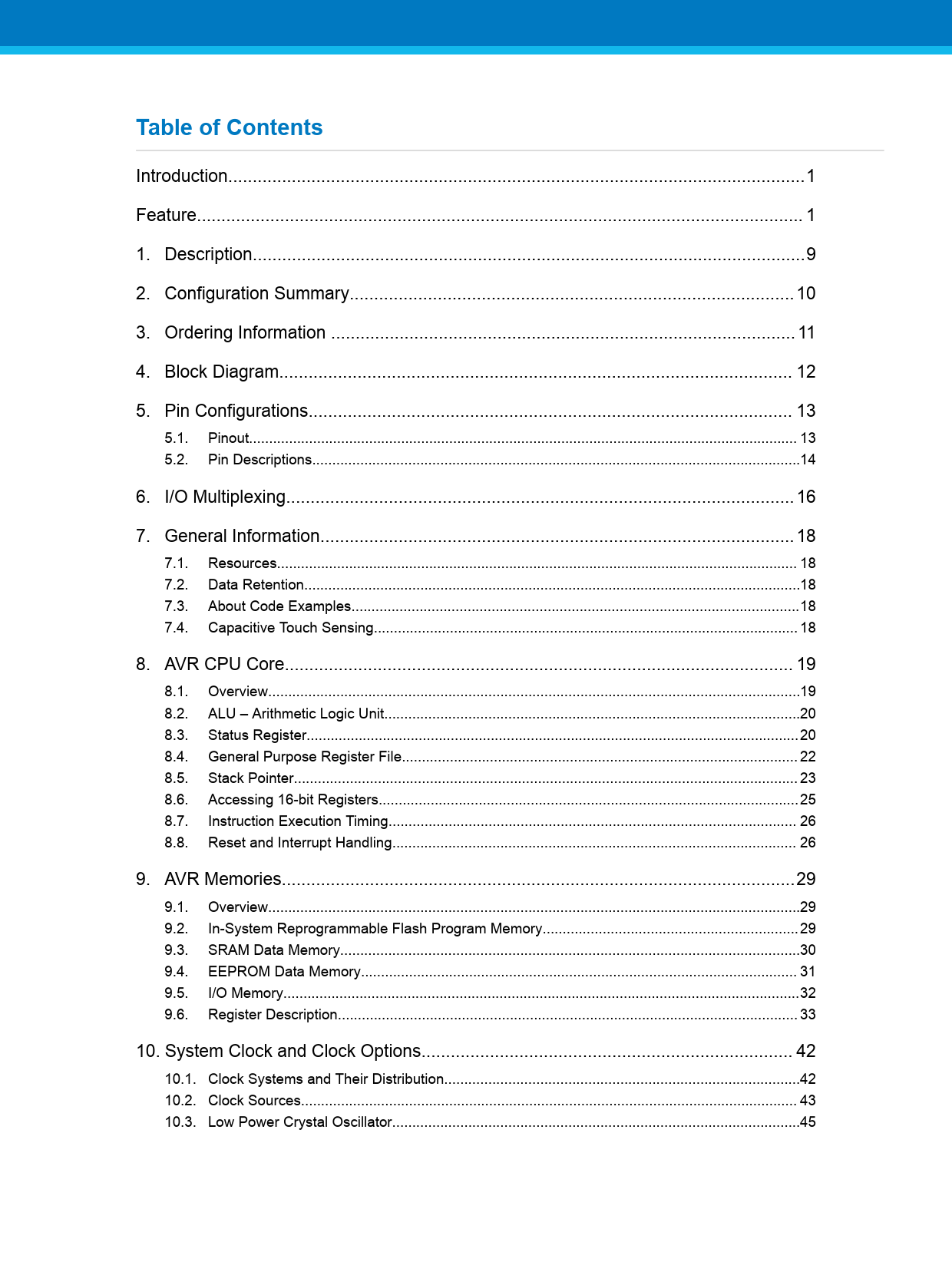 Introduction..1 Feature.. 1 1. Description...9 2. Configuration Summary... 10 3. Ordering Information ... 11 4. Block Diagram... 12 5. Pin Configurations... 13 5.1. Pinout... 13 5.2. Pin Descriptions..14 6. I/O Multiplexing.. 16 7. General Information... 18 7.1. Resources.. 18 7.2. Data Retention..18 7.3. About Code Examples..18 7.4. Capacitive Touch Sensing.. 18 8. AVR CPU Core.. 19 8.1. Overview...19 8.2. ALU – Arithmetic Logic Unit..20 8.3. Status Register...20 8.4. General Purpose Register File... 22 8.5. Stack Pointer.. 23 8.6. Accessing 16-bit Registers...25 8.7. Instruction Execution Timing.. 26 8.8. Reset and Interrupt Handling... 26 9. AVR Memories...29 9.1. Overview...29 9.2. In-System Reprogrammable Flash Program Memory..29 9.3. SRAM Data Memory...30 9.4. EEPROM Data Memory... 31 9.5. I/O Memory...32 9.6. Register Description... 33 10. System Clock and Clock Options.. 42 10.1. Clock Systems and Their Distribution...42 10.2. Clock Sources.. 43 10.3. Low Power Crystal Oscillator..45 Document Outline Introduction Feature Table of Contents 1. Description 2. Configuration Summary 3. Ordering Information 4. Block Diagram 5. Pin Configurations 5.1. Pinout 5.1.1. PDIP 5.1.2. TQFN and QFN 5.2. Pin Descriptions 5.2.1. VCC 5.2.2. GND 5.2.3. Port A (PA[7:0]) 5.2.4. Port B (PB[7:0]) 5.2.5. Port C (PC[7:0]) 5.2.6. Port D (PD[7:0]) 5.2.7. RESET 5.2.8. XTAL1 5.2.9. XTAL2 5.2.10. AVCC 5.2.11. AREF 6. I/O Multiplexing 7. General Information 7.1. Resources 7.2. Data Retention 7.3. About Code Examples 7.4. Capacitive Touch Sensing 7.4.1. QTouch Library 8. AVR CPU Core 8.1. Overview 8.2. ALU – Arithmetic Logic Unit 8.3. Status Register 8.3.1. Status Register 8.4. General Purpose Register File 8.4.1. The X-register, Y-register, and Z-register 8.5. Stack Pointer 8.5.1. Stack Pointer Register Low and High byte 8.5.2. Extended Z-pointer Register for ELPM/SPM 8.6. Accessing 16-bit Registers 8.7. Instruction Execution Timing 8.8. Reset and Interrupt Handling 8.8.1. Interrupt Response Time 9. AVR Memories 9.1. Overview 9.2. In-System Reprogrammable Flash Program Memory 9.3. SRAM Data Memory 9.3.1. Data Memory Access Times 9.4. EEPROM Data Memory 9.4.1. EEPROM Read/Write Access 9.4.2. Preventing EEPROM Corruption 9.5. I/O Memory 9.5.1. General Purpose I/O Registers 9.6. Register Description 9.6.1. Accessing 16-bit Registers 9.6.2. EEPROM Address Register Low and High Byte 9.6.3. EEPROM Data Register 9.6.4. EEPROM Control Register 9.6.5. GPIOR2 – General Purpose I/O Register 2 9.6.6. GPIOR1 – General Purpose I/O Register 1 9.6.7. GPIOR0 – General Purpose I/O Register 0 10. System Clock and Clock Options 10.1. Clock Systems and Their Distribution 10.1.1. CPU Clock – clkCPU 10.1.2. I/O Clock – clkI/O 10.1.3. Flash Clock – clkFLASH 10.1.4. Asynchronous Timer Clock – clkASY 10.1.5. ADC Clock – clkADC 10.2. Clock Sources 10.2.1. Default Clock Source 10.2.2. Clock Startup Sequence 10.2.3. Clock Source Connections 10.3. Low Power Crystal Oscillator 10.4. Full Swing Crystal Oscillator 10.5. Low Frequency Crystal Oscillator 10.6. Calibrated Internal RC Oscillator 10.7. 128kHz Internal Oscillator 10.8. External Clock 10.9. Timer/Counter Oscillator 10.10. Clock Output Buffer 10.11. System Clock Prescaler 10.12. Register Description 10.12.1. Oscillator Calibration Register 10.12.2. Clock Prescaler Register 11. PM - Power Management and Sleep Modes 11.1. Overview 11.2. Sleep Modes 11.3. BOD Disable 11.4. Idle Mode 11.5. ADC Noise Reduction Mode 11.6. Power-Down Mode 11.7. Power-Save Mode 11.8. Standby Mode 11.9. Extended Standby Mode 11.10. Power Reduction Registers 11.11. Minimizing Power Consumption 11.11.1. Analog to Digital Converter 11.11.2. Analog Comparator 11.11.3. Brown-Out Detector 11.11.4. Internal Voltage Reference 11.11.5. Watchdog Timer 11.11.6. Port Pins 11.11.7. On-chip Debug System 11.12. Register Description 11.12.1. Sleep Mode Control Register 11.12.2. MCU Control Register 11.12.3. Power Reduction Register 0 11.12.4. Power Reduction Register 1 12. SCRST - System Control and Reset 12.1. Resetting the AVR 12.2. Reset Sources 12.3. Power-on Reset 12.4. External Reset 12.5. Brown-out Detection 12.6. Watchdog System Reset 12.7. Internal Voltage Reference 12.7.1. Voltage Reference Enable Signals and Start-up Time 12.8. Watchdog Timer 12.8.1. Features 12.8.2. Overview 12.9. Register Description 12.9.1. MCU Status Register 12.9.2. WDTCSR – Watchdog Timer Control Register 13. Interrupts 13.1. Overview 13.2. Interrupt Vectors in ATmega1284P 13.3. Register Description 13.3.1. Moving Interrupts Between Application and Boot Space 13.3.2. MCU Control Register 14. External Interrupts 14.1. EXINT - External Interrupts 14.1.1. Pin Change Interrupt Timing 14.1.2. Register Description 14.1.2.1. External Interrupt Control Register A 14.1.2.2. External Interrupt Mask Register 14.1.2.3. External Interrupt Flag Register 14.1.2.4. Pin Change Interrupt Control Register 14.1.2.5. Pin Change Interrupt Flag Register 14.1.2.6. Pin Change Mask Register 0 14.1.2.7. Pin Change Mask Register 1 14.1.2.8. Pin Change Mask Register 2 14.1.2.9. Pin Change Mask Register 3 15. I/O-Ports 15.1. Overview 15.2. Ports as General Digital I/O 15.2.1. Configuring the Pin 15.2.2. Toggling the Pin 15.2.3. Switching Between Input and Output 15.2.4. Reading the Pin Value 15.2.5. Digital Input Enable and Sleep Modes 15.2.6. Unconnected Pins 15.3. Alternate Port Functions 15.3.1. Alternate Functions of Port A 15.3.2. Alternate Functions of Port B 15.3.3. Alternate Functions of Port C 15.3.4. Alternate Functions of Port D 15.4. Register Description 15.4.1. MCU Control Register 15.4.2. Port A Data Register 15.4.3. Port A Data Direction Register 15.4.4. Port A Input Pins Address 15.4.5. Port B Data Register 15.4.6. Port B Data Direction Register 15.4.7. Port B Input Pins Addr