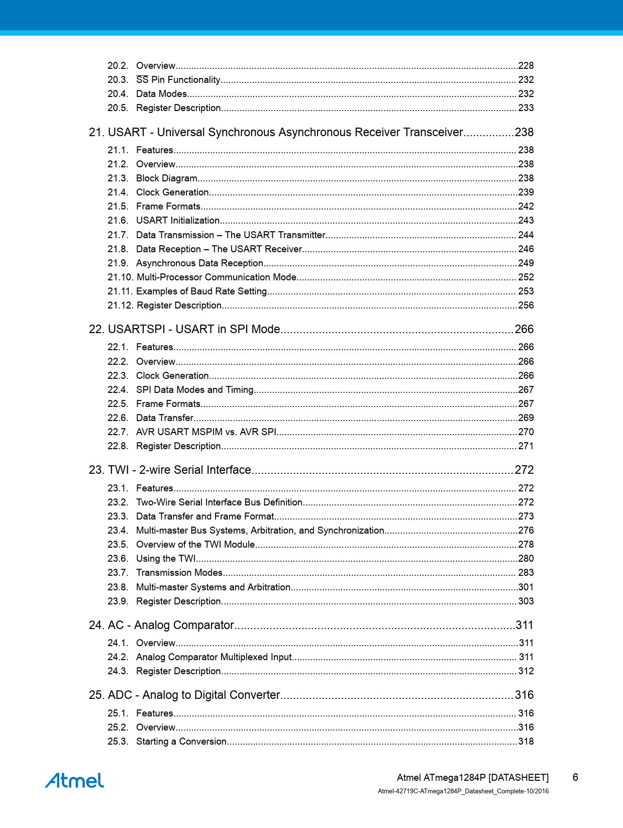 link to page 228 link to page 232 link to page 232 link to page 233 link to page 238 link to page 238 link to page 238 link to page 238 link to page 239 link to page 242 link to page 243 link to page 244 link to page 246 link to page 249 link to page 252 link to page 253 link to page 256 link to page 266 link to page 266 link to page 266 link to page 266 link to page 267 link to page 267 link to page 269 link to page 270 link to page 271 link to page 272 link to page 272 link to page 272 link to page 273 link to page 276 link to page 278 link to page 280 link to page 283 link to page 301 link to page 303 link to page 311 link to page 311 link to page 311 link to page 312 link to page 316 link to page 316 link to page 316 link to page 318 20.2. Overview...228 20.3. SS Pin Functionality... 232 20.4. Data Modes.. 232 20.5. Register Description... 233 21. USART - Universal Synchronous Asynchronous Receiver Transceiver..238 21.1. Features... 238 21.2. Overview...238 21.3. Block Diagram.. 238 21.4. Clock Generation..239 21.5. Frame Formats...242 21.6. USART Initialization..243 21.7. Data Transmission – The USART Transmitter... 244 21.8. Data Reception – The USART Receiver.. 246 21.9. Asynchronous Data Reception...249 21.10. Multi-Processor Communication Mode.. 252 21.11. Examples of Baud Rate Setting... 253 21.12. Register Description...256 22. USARTSPI - USART in SPI Mode...266 22.1. Features... 266 22.2. Overview...266 22.3. Clock Generation..266 22.4. SPI Data Modes and Timing...267 22.5. Frame Formats...267 22.6. Data Transfer..269 22.7. AVR USART MSPIM vs. AVR SPI..270 22.8. Register Description... 271 23. TWI - 2-wire Serial Interface..272 23.1. Features... 272 23.2. Two-Wire Serial Interface Bus Definition..272 23.3. Data Transfer and Frame Format...273 23.4. Multi-master Bus Systems, Arbitration, and Synchronization...276 23.5. Overview of the TWI Module.. 278 23.6. Using the TWI...280 23.7. Transmission Modes.. 283 23.8. Multi-master Systems and Arbitration...301 23.9. Register Description... 303 24. AC - Analog Comparator..311 24.1. Overview...311 24.2. Analog Comparator Multiplexed Input.. 311 24.3. Register Description... 312 25. ADC - Analog to Digital Converter...316 25.1. Features... 316 25.2. Overview...316 25.3. Starting a Conversion...318 Atmel ATmega1284P [DATASHEET] 6 Atmel-42719C-ATmega1284P_Datasheet_Complete-10/2016 Document Outline Introduction Feature Table of Contents 1. Description 2. Configuration Summary 3. Ordering Information 4. Block Diagram 5. Pin Configurations 5.1. Pinout 5.1.1. PDIP 5.1.2. TQFN and QFN 5.2. Pin Descriptions 5.2.1. VCC 5.2.2. GND 5.2.3. Port A (PA[7:0]) 5.2.4. Port B (PB[7:0]) 5.2.5. Port C (PC[7:0]) 5.2.6. Port D (PD[7:0]) 5.2.7. RESET 5.2.8. XTAL1 5.2.9. XTAL2 5.2.10. AVCC 5.2.11. AREF 6. I/O Multiplexing 7. General Information 7.1. Resources 7.2. Data Retention 7.3. About Code Examples 7.4. Capacitive Touch Sensing 7.4.1. QTouch Library 8. AVR CPU Core 8.1. Overview 8.2. ALU – Arithmetic Logic Unit 8.3. Status Register 8.3.1. Status Register 8.4. General Purpose Register File 8.4.1. The X-register, Y-register, and Z-register 8.5. Stack Pointer 8.5.1. Stack Pointer Register Low and High byte 8.5.2. Extended Z-pointer Register for ELPM/SPM 8.6. Accessing 16-bit Registers 8.7. Instruction Execution Timing 8.8. Reset and Interrupt Handling 8.8.1. Interrupt Response Time 9. AVR Memories 9.1. Overview 9.2. In-System Reprogrammable Flash Program Memory 9.3. SRAM Data Memory 9.3.1. Data Memory Access Times 9.4. EEPROM Data Memory 9.4.1. EEPROM Read/Write Access 9.4.2. Preventing EEPROM Corruption 9.5. I/O Memory 9.5.1. General Purpose I/O Registers 9.6. Register Description 9.6.1. Accessing 16-bit Registers 9.6.2. EEPROM Address Register Low and High Byte 9.6.3. EEPROM Data Register 9.6.4. EEPROM Control Register 9.6.5. GPIOR2 – General Purpose I/O Register 2 9.6.6. GPIOR1 – General Purpose I/O Register 1 9.6.7. GPIOR0 – General Purpose I/O Register 0 10. System Clock and Clock Options 10.1. Clock Systems and Their Distribution 10.1.1. CPU Clock – clkCPU 10.1.2. I/O Clock – clkI/O 10.1.3. Flash Clock – clkFLASH 10.1.4. Asynchronous Timer Clock – clkASY 10.1.5. ADC Clock – clkADC 10.2. Clock Sources 10.2.1. Default Clock Source 10.2.2. Clock Startup Sequence 10.2.3. Clock Source Connections 10.3. Low Power Crystal Oscillator 10.4. Full Swing Crystal Oscillator 10.5. Low Frequency Crystal Oscillator 10.6. Calibrated Internal RC Oscillator 10.7. 128kHz Internal Oscillator 10.8. External Clock 10.9. Timer/Counter Oscillator 10.10. Clock Output Buffer 10.11. System Clock Prescaler 10.12. Register Description 10.12.1. Oscillator Calibration Register 10.12.2. Clock Prescaler Register 11. PM - Power Management and Sleep Modes 11.1. Overview 11.2. Sleep Modes 11.3. BOD Disable 11.4. Idle Mode 11.5. ADC Noise Reduction Mode 11.6. Power-Down Mode 11.7. Power-Save Mode 11.8. Standby Mode 11.9. Extended Standby Mode 11.10. Power Reduction Registers 11.11. Minimizing Power Consumption 11.11.1. Analog to Digital Converter 11.11.2. Analog Comparator 11.11.3. Brown-Out Detector 11.11.4. Internal Voltage Reference 11.11.5. Watchdog Timer 11.11.6. Port Pins 11.11.7. On-chip Debug System 11.12. Register Description 11.12.1. Sleep Mode Control Register 11.12.2. MCU Control Register 11.12.3. Power Reduction Register 0 11.12.4. Power Reduction Register 1 12. SCRST - System Control and Reset 12.1. Resetting the AVR 12.2. Reset Sources 12.3. Power-on Reset 12.4. External Reset 12.5. Brown-out Detection 12.6. Watchdog System Reset 12.7. Internal Voltage Reference 12.7.1. Voltage Reference Enable Signals and Start-up Time 12.8. Watchdog Timer 12.8.1. Features 12.8.2. Overview 12.9. Register Description 12.9.1. MCU Status Register 12.9.2. WDTCSR – Watchdog Timer Control Register 13. Interrupts 13.1. Overview 13.2. Interrupt Vectors in ATmega1284P 13.3. Register Description 13.3.1. Moving Interrupts Between Application and Boot Space 13.3.2. MCU Contro