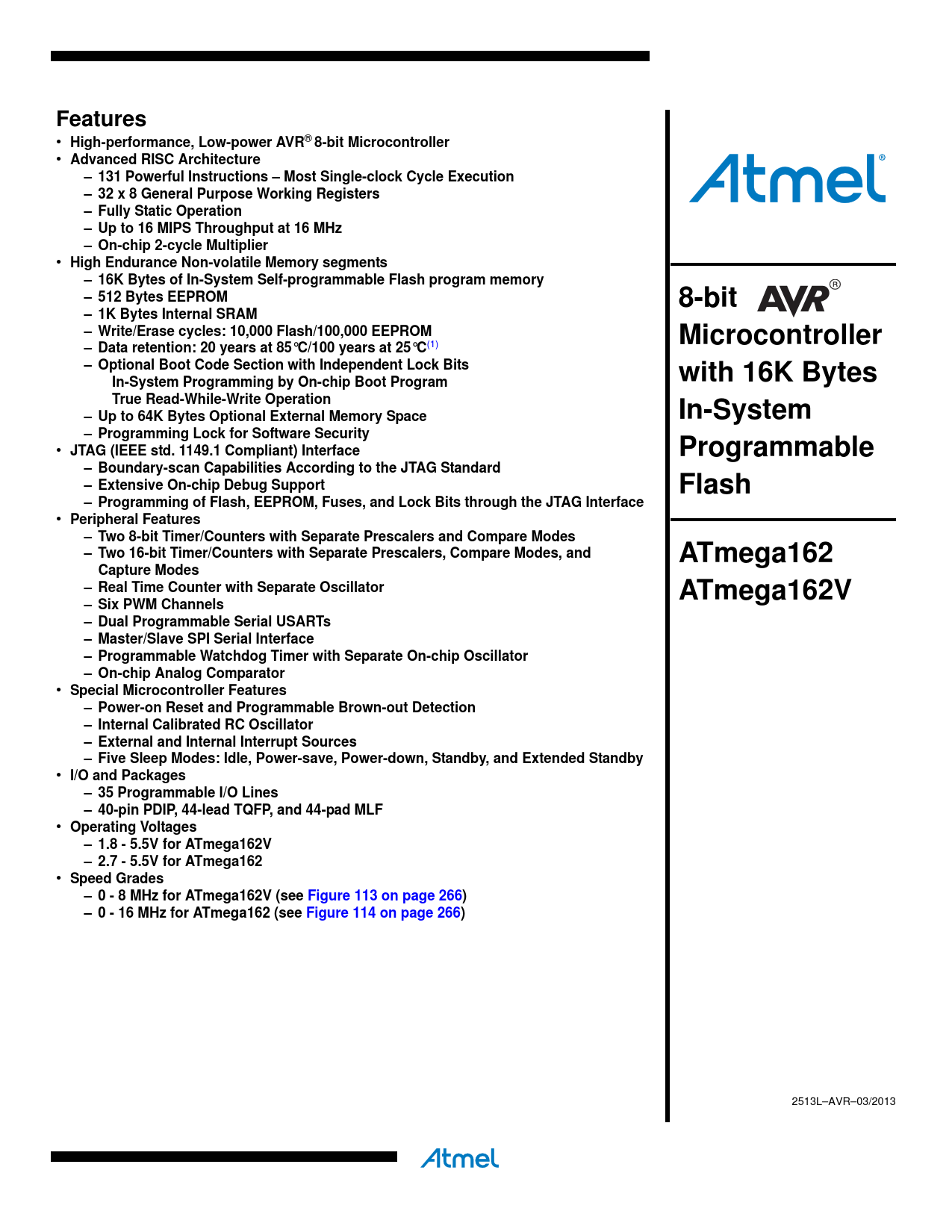 link to page 266 link to page 266 link to page 7 Features • High-performance, Low-power AVR ® 8-bit Microcontroller • Advanced RISC Architecture– 131 Powerful Instructions – Most Single-clock Cycle Execution – 32 x 8 General Purpose Working Registers – Fully Static Operation – Up to 16 MIPS Throughput at 16 MHz – On-chip 2-cycle Multiplier • High Endurance Non-volatile Memory segments– 16K Bytes of In-System Self-programmable Flash program memory – 512 Bytes EEPROM8-bit– 1K Bytes Internal SRAM – Write/Erase cycles: 10,000 Flash/100,000 EEPROMMicrocontroller– Data retention: 20 years at 85°C/100 years at 25°C (1) – Optional Boot Code Section with Independent Lock Bitswith 16K BytesIn-System Programming by On-chip Boot Program True Read-While-Write Operation– Up to 64K Bytes Optional External Memory SpaceIn-System– Programming Lock for Software Security • JTAG (IEEE std. 1149.1 Compliant) InterfaceProgrammable– Boundary-scan Capabilities According to the JTAG Standard – Extensive On-chip Debug SupportFlash– Programming of Flash, EEPROM, Fuses, and Lock Bits through the JTAG Interface • Peripheral Features– Two 8-bit Timer/Counters with Separate Prescalers and Compare Modes – Two 16-bit Timer/Counters with Separate Prescalers, Compare Modes, andATmega162Capture Modes– Real Time Counter with Separate OscillatorATmega162V– Six PWM Channels – Dual Programmable Serial USARTs – Master/Slave SPI Serial Interface – Programmable Watchdog Timer with Separate On-chip Oscillator – On-chip Analog Comparator • Special Microcontroller Features– Power-on Reset and Programmable Brown-out Detection – Internal Calibrated RC Oscillator – External and Internal Interrupt Sources – Five Sleep Modes: Idle, Power-save, Power-down, Standby, and Extended Standby • I/O and Packages– 35 Programmable I/O Lines – 40-pin PDIP, 44-lead TQFP, and 44-pad MLF • Operating Voltages– 1.8 - 5.5V for ATmega162V – 2.7 - 5.5V for ATmega162 • Speed Grades– 0 - 8 MHz for ATmega162V (see Figure 113 on page 266)– 0 - 16 MHz for ATmega162 (see Figure 114 on page 266) 2513L–AVR–03/2013 Document Outline Features Pin Configurations Disclaimer Overview Block Diagram ATmega161 and ATmega162 Compatibility ATmega161 Compatibility Mode Pin Descriptions VCC GND Port A (PA7..PA0) Port B (PB7..PB0) Port C (PC7..PC0) Port D (PD7..PD0) Port E(PE2..PE0) RESET XTAL1 XTAL2 Resources Data Retention About Code Examples AVR CPU Core Introduction Architectural Overview ALU – Arithmetic Logic Unit Status Register General Purpose Register File The X-register, Y- register, and Z-register Stack Pointer Instruction Execution Timing Reset and Interrupt Handling Interrupt Response Time AVR ATmega162 Memories In-System Reprogrammable Flash Program Memory SRAM Data Memory Data Memory Access Times EEPROM Data Memory EEPROM Read/Write Access The EEPROM Address Register – EEARH and EEARL The EEPROM Data Register – EEDR The EEPROM Control Register – EECR EEPROM Write During Power-down Sleep Mode Preventing EEPROM Corruption I/O Memory External Memory Interface Overview Using the External Memory Interface Address Latch Requirements Pull-up and Bus Keeper Timing XMEM Register Description MCU Control Register – MCUCR Extended MCU Control Register – EMCUCR Special Function IO Register – SFIOR Using all Locations of External Memory Smaller than 64 KB Using all 64KB Locations of External Memory System Clock and Clock Options Clock Systems and their Distribution CPU clock – clkCPU I/O clock – clkI/O Flash clock – clkFLASH Asynchronous Timer clock – clkASY Clock Sources Default Clock Source Crystal Oscillator Low-frequency Crystal Oscillator Calibrated Internal RC Oscillator Oscillator Calibration Register – OSCCAL External Clock Clock output buffer Timer/Counter Oscillator System Clock Prescaler Clock Prescale Register – CLKPR Power Management and Sleep Modes MCU Control Register – MCUCR MCU Control and Status Register – MCUCSR Extended MCU Control Register – EMCUCR Idle Mode Power-down Mode Power-save Mode Standby Mode Extended Standby Mode Minimizing Power Consumption Analog Comparator Brown-out Detector Internal Voltage Reference Watchdog Timer Port Pins JTAG Interface and On-chip Debug System System Control and Reset Resetting the AVR Reset Sources Power-on Reset External Reset Brown-out Detection Watchdog Reset MCU Control and Status Register – MCUCSR Internal Voltage Reference Voltage Reference Enable Signals and Start-up Time Watchdog Timer Watchdog Timer Control Register – WDTCR Timed Sequences for Changing the Configuration of the Watchdog Timer Safety Level 0 Safety Level 1 Safety Level 2 Interrupts Interrupt Vectors in ATmega162 Moving Interrupts Between Application and Boot Space General Interrupt Control Register – GICR I/O-Ports Introduction Ports as General Digital I/O Configuring the Pin Reading the Pin Value Digital Input Enable and Sleep Modes Unconnected pins Alternate Port Functions Special Function IO Register – SFIOR Alternate Functions of Port A Alternate Functions Of Port B Alternate Functions of Port C Alternate Functions of Port D Alternate Functions of Port E Register Description for I/O- Ports Port A Data Register – PORTA Port A Data Direction Register – DDRA Port A Input Pins Address – PINA Port B Data Register – PORTB Port B Data Direction Register – DDRB Port B Input Pins Address – PINB Port C Data Register – PORTC Port C Data Direction Register – DDRC Port C Input Pins Address – PINC Port D Data Register – PORTD Port D Data Direction Register – DDRD Port D Input Pins Address – PIND Port E Data Register – PORTE Port E Data Direction Register – DDRE Port E Input Pins Address – PINE External Interrupts MCU Control Register – MCUCR Extended MCU Control Register – EMCUCR General Interrupt Control Register – GICR General Interrupt Flag Register – GIFR Pin Change Mask Register 1 