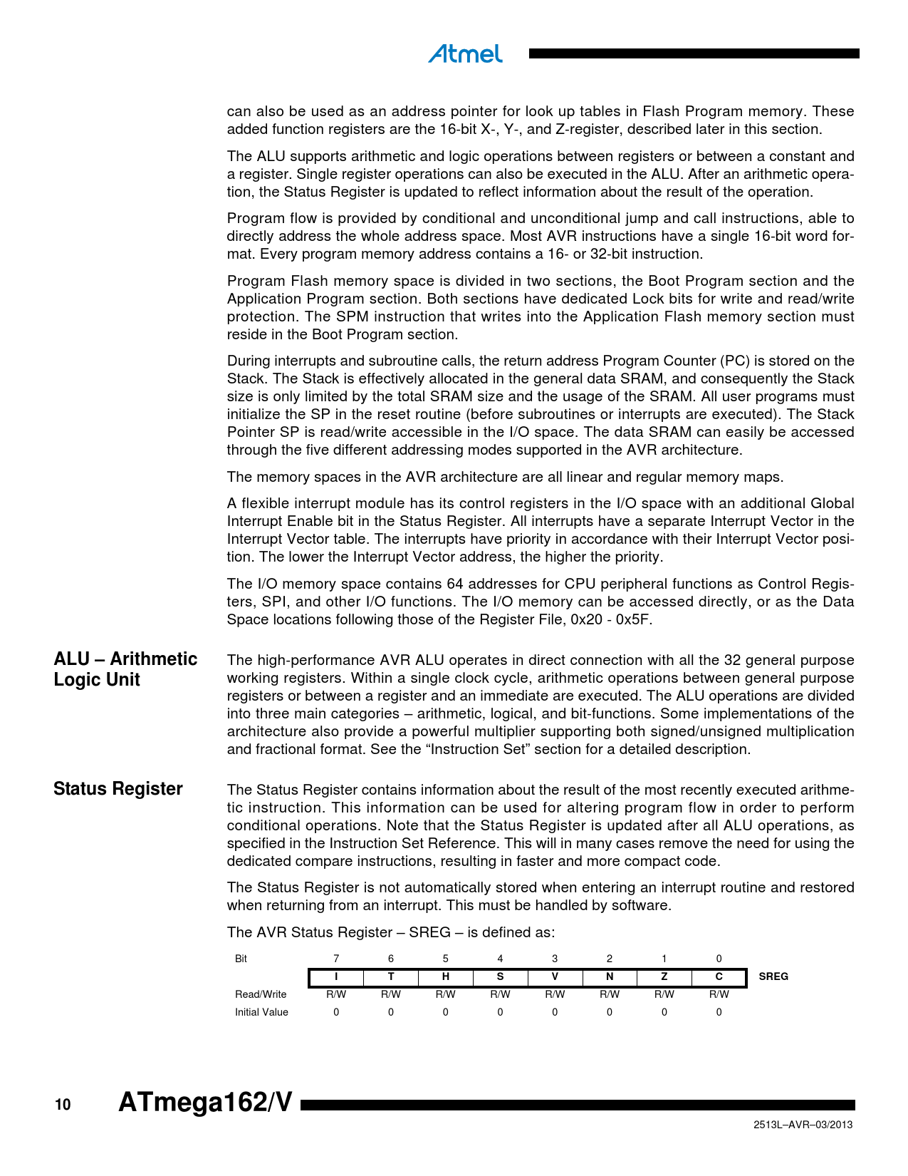 can also be used as an address pointer for look up tables in Flash Program memory. These added function registers are the 16-bit X-, Y-, and Z-register, described later in this section. The ALU supports arithmetic and logic operations between registers or between a constant and a register. Single register operations can also be executed in the ALU. After an arithmetic opera- tion, the Status Register is updated to reflect information about the result of the operation. Program flow is provided by conditional and unconditional jump and call instructions, able to directly address the whole address space. Most AVR instructions have a single 16-bit word for- mat. Every program memory address contains a 16- or 32-bit instruction. Program Flash memory space is divided in two sections, the Boot Program section and the Application Program section. Both sections have dedicated Lock bits for write and read/write protection. The SPM instruction that writes into the Application Flash memory section must reside in the Boot Program section. During interrupts and subroutine calls, the return address Program Counter (PC) is stored on the Stack. The Stack is effectively allocated in the general data SRAM, and consequently the Stack size is only limited by the total SRAM size and the usage of the SRAM. All user programs must initialize the SP in the reset routine (before subroutines or interrupts are executed). The Stack Pointer SP is read/write accessible in the I/O space. The data SRAM can easily be accessed through the five different addressing modes supported in the AVR architecture. The memory spaces in the AVR architecture are all linear and regular memory maps. A flexible interrupt module has its control registers in the I/O space with an additional Global Interrupt Enable bit in the Status Register. All interrupts have a separate Interrupt Vector in the Interrupt Vector table. The interrupts have priority in accordance with their Interrupt Vector posi- tion. The lower the Interrupt Vector address, the higher the priority. The I/O memory space contains 64 addresses for CPU peripheral functions as Control Regis- ters, SPI, and other I/O functions. The I/O memory can be accessed directly, or as the Data Space locations following those of the Register File, 0x20 - 0x5F. ALU – Arithmetic The high-performance AVR ALU operates in direct connection with all the 32 general purpose Logic Unit working registers. Within a single clock cycle, arithmetic operations between general purpose registers or between a register and an immediate are executed. The ALU operations are divided into three main categories – arithmetic, logical, and bit-functions. Some implementations of the architecture also provide a powerful multiplier supporting both signed/unsigned multiplication and fractional format. See the “Instruction Set” section for a detailed description. Status Register The Status Register contains information about the result of the most recently executed arithme- tic instruction. This information can be used for altering program flow in order to perform conditional operations. Note that the Status Register is updated after all ALU operations, as specified in the Instruction Set Reference. This will in many cases remove the need for using the dedicated compare instructions, resulting in faster and more compact code. The Status Register is not automatically stored when entering an interrupt routine and restored when returning from an interrupt. This must be handled by software. The AVR Status Register – SREG – is defined as: Bit 7 6 5 4 3 2 1 0 ITHSVNZCSREG Read/Write R/W R/W R/W R/W R/W R/W R/W R/W Initial Value 0 0 0 0 0 0 0 0 10ATmega162/V 2513L–AVR–03/2013 Document Outline Features Pin Configurations Disclaimer Overview Block Diagram ATmega161 and ATmega162 Compatibility ATmega161 Compatibility Mode Pin Descriptions VCC GND Port A (PA7..PA0) Port B (PB7..PB0) Port C (PC7..PC0) Port D (PD7..PD0) Port E(PE2..PE0) RESET XTAL1 XTAL2 Resources Data Retention About Code Examples AVR CPU Core Introduction Architectural Overview ALU – Arithmetic Logic Unit Status Register General Purpose Register File The X-register, Y- register, and Z-register Stack Pointer Instruction Execution Timing Reset and Interrupt Handling Interrupt Response Time AVR ATmega162 Memories In-System Reprogrammable Flash Program Memory SRAM Data Memory Data Memory Access Times EEPROM Data Memory EEPROM Read/Write Access The EEPROM Address Register – EEARH and EEARL The EEPROM Data Register – EEDR The EEPROM Control Register – EECR EEPROM Write During Power-down Sleep Mode Preventing EEPROM Corruption I/O Memory External Memory Interface Overview Using the External Memory Interface Address Latch Requirements Pull-up and Bus Keeper Timing XMEM Register Description MCU Control Register – MCUCR Extended MCU Control Register – EMCUCR Special Function IO Register – SFIOR Using all Locations of External Memory Smaller than 64 KB Using all 64KB Locations of External Memory System Clock and Clock Options Clock Systems and their Distribution CPU clock – clkCPU I/O clock – clkI/O Flash clock – clkFLASH Asynchronous Timer clock – clkASY Clock Sources Default Clock Source Crystal Oscillator Low-frequency Crystal Oscillator Calibrated Internal RC Oscillator Oscillator Calibration Register – OSCCAL External Clock Clock output buffer Timer/Counter Oscillator System Clock Prescaler Clock Prescale Register – CLKPR Power Management and Sleep Modes MCU Control Register – MCUCR MCU Control and Status Register – MCUCSR Extended MCU Control Register – EMCUCR Idle Mode Power-down Mode Power-save Mode Standby Mode Extended Standby Mode Minimizing Power Consumption Analog Comparator Brown-out Detector Internal Voltage Reference Watchdog Timer Port Pins JTAG Interface and On-chip Debug System System Control and Reset Resetting the AVR Reset Sources Power-on Reset External Reset Brown-out Detection Watchdog Reset MCU Control an