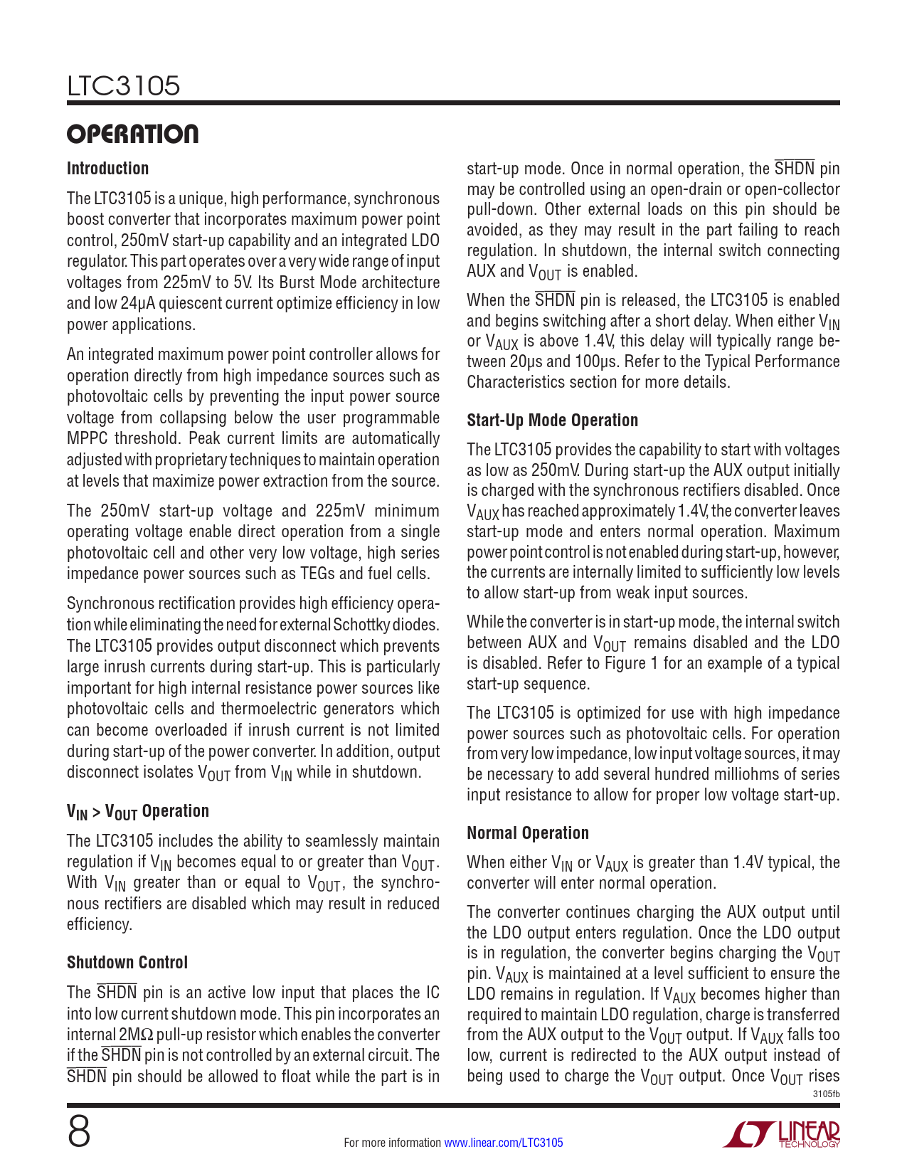 LTC3105 OPERATIONIntroduction start-up mode. Once in normal operation, the SHDN pin The LTC3105 is a unique, high performance, synchronous may be controlled using an open-drain or open-collector boost converter that incorporates maximum power point pull-down. Other external loads on this pin should be control, 250mV start-up capability and an integrated LDO avoided, as they may result in the part failing to reach regulator. This part operates over a very wide range of input regulation. In shutdown, the internal switch connecting AUX and V voltages from 225mV to 5V. Its Burst Mode architecture OUT is enabled. and low 24µA quiescent current optimize efficiency in low When the SHDN pin is released, the LTC3105 is enabled power applications. and begins switching after a short delay. When either VIN or V An integrated maximum power point controller allows for AUX is above 1.4V, this delay will typically range be- tween 20µs and 100µs. Refer to the Typical Performance operation directly from high impedance sources such as Characteristics section for more details. photovoltaic cells by preventing the input power source voltage from collapsing below the user programmable Start-Up Mode Operation MPPC threshold. Peak current limits are automatically adjusted with proprietary techniques to maintain operation The LTC3105 provides the capability to start with voltages at levels that maximize power extraction from the source. as low as 250mV. During start-up the AUX output initially is charged with the synchronous rectifiers disabled. Once The 250mV start-up voltage and 225mV minimum VAUX has reached approximately 1.4V, the converter leaves operating voltage enable direct operation from a single start-up mode and enters normal operation. Maximum photovoltaic cell and other very low voltage, high series power point control is not enabled during start-up, however, impedance power sources such as TEGs and fuel cells. the currents are internally limited to sufficiently low levels Synchronous rectification provides high efficiency opera- to allow start-up from weak input sources. tion while eliminating the need for external Schottky diodes. While the converter is in start-up mode, the internal switch The LTC3105 provides output disconnect which prevents between AUX and VOUT remains disabled and the LDO large inrush currents during start-up. This is particularly is disabled. Refer to Figure 1 for an example of a typical important for high internal resistance power sources like start-up sequence. photovoltaic cells and thermoelectric generators which The LTC3105 is optimized for use with high impedance can become overloaded if inrush current is not limited power sources such as photovoltaic cells. For operation during start-up of the power converter. In addition, output from very low impedance, low input voltage sources, it may disconnect isolates VOUT from VIN while in shutdown. be necessary to add several hundred milliohms of series input resistance to allow for proper low voltage start-up. VIN > VOUT Operation The LTC3105 includes the ability to seamlessly maintain Normal Operation regulation if VIN becomes equal to or greater than VOUT. When either VIN or VAUX is greater than 1.4V typical, the With VIN greater than or equal to VOUT, the synchro- converter will enter normal operation. nous rectifiers are disabled which may result in reduced The converter continues charging the AUX output until efficiency. the LDO output enters regulation. Once the LDO output Shutdown Control is in regulation, the converter begins charging the VOUT pin. VAUX is maintained at a level sufficient to ensure the The SHDN pin is an active low input that places the IC LDO remains in regulation. If VAUX becomes higher than into low current shutdown mode. This pin incorporates an required to maintain LDO regulation, charge is transferred internal 2MΩ pull-up resistor which enables the converter from the AUX output to the VOUT output. If VAUX falls too if the SHDN pin is not controlled by an external circuit. The low, current is redirected to the AUX output instead of SHDN pin should be allowed to float while the part is in being used to charge the VOUT output. Once VOUT rises 3105fb 8 For more information www.linear.com/LTC3105 Document Outline Features Description Applications Typical Application Absolute Maximum Ratings Pin Configuration Order Information Electrical Characteristics Typical Performance Characteristics Pin Functions Block Diagram Operation Applications Information Typical Application Related Parts