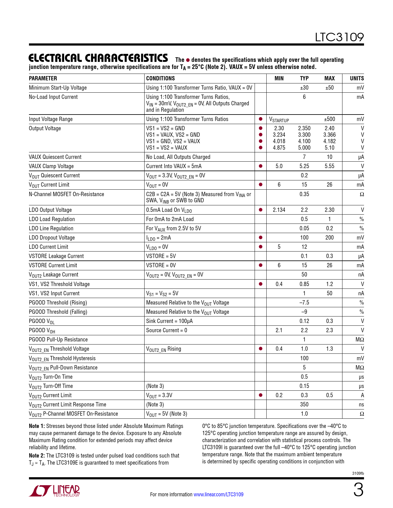 LTC3109 elecTrical characTerisTicsThe l denotes the specifications which apply over the full operatingjunction temperature range, otherwise specifications are for TA = 25°C (Note 2). VAUX = 5V unless otherwise noted. PARAMETERCONDITIONSMINTYPMAXUNITS Minimum Start-Up Voltage Using 1:100 Transformer Turns Ratio, VAUX = 0V ±30 ±50 mV No-Load Input Current Using 1:100 Transformer Turns Ratios, 6 mA VIN = 30mV, VOUT2_EN = 0V, All Outputs Charged and in Regulation Input Voltage Range Using 1:100 Transformer Turns Ratios l VSTARTUP ±500 mV Output Voltage VS1 = VS2 = GND l 2.30 2.350 2.40 V VS1 = VAUX, VS2 = GND l 3.234 3.300 3.366 V VS1 = GND, VS2 = VAUX l 4.018 4.100 4.182 V VS1 = VS2 = VAUX l 4.875 5.000 5.10 V VAUX Quiescent Current No Load, All Outputs Charged 7 10 µA VAUX Clamp Voltage Current Into VAUX = 5mA l 5.0 5.25 5.55 V VOUT Quiescent Current VOUT = 3.3V, VOUT2_EN = 0V 0.2 µA VOUT Current Limit VOUT = 0V l 6 15 26 mA N-Channel MOSFET On-Resistance C2B = C2A = 5V (Note 3) Measured from VINA or 0.35 Ω SWA, VINB or SWB to GND LDO Output Voltage 0.5mA Load On VLDO l 2.134 2.2 2.30 V LDO Load Regulation For 0mA to 2mA Load 0.5 1 % LDO Line Regulation For VAUX from 2.5V to 5V 0.05 0.2 % LDO Dropout Voltage ILDO = 2mA l 100 200 mV LDO Current Limit VLDO = 0V l 5 12 mA VSTORE Leakage Current VSTORE = 5V 0.1 0.3 µA VSTORE Current Limit VSTORE = 0V l 6 15 26 mA VOUT2 Leakage Current VOUT2 = 0V, VOUT2_EN = 0V 50 nA VS1, VS2 Threshold Voltage l 0.4 0.85 1.2 V VS1, VS2 Input Current VS1 = VS2 = 5V 1 50 nA PGOOD Threshold (Rising) Measured Relative to the VOUT Voltage –7.5 % PGOOD Threshold (Falling) Measured Relative to the VOUT Voltage –9 % PGOOD VOL Sink Current = 100µA 0.12 0.3 V PGOOD VOH Source Current = 0 2.1 2.2 2.3 V PGOOD Pull-Up Resistance 1 MΩ VOUT2_EN Threshold Voltage VOUT2_EN Rising l 0.4 1.0 1.3 V VOUT2_EN Threshold Hysteresis 100 mV VOUT2_EN Pull-Down Resistance 5 MΩ VOUT2 Turn-On Time 0.5 µs VOUT2 Turn-Off Time (Note 3) 0.15 µs VOUT2 Current Limit VOUT = 3.3V l 0.2 0.3 0.5 A VOUT2 Current Limit Response Time (Note 3) 350 ns VOUT2 P-Channel MOSFET On-Resistance VOUT = 5V (Note 3) 1.0 Ω Note 1: Stresses beyond those listed under Absolute Maximum Ratings 0°C to 85°C junction temperature. Specifications over the –40°C to may cause permanent damage to the device. Exposure to any Absolute 125°C operating junction temperature range are assured by design, Maximum Rating condition for extended periods may affect device characterization and correlation with statistical process controls. The reliability and lifetime. LTC3109I is guaranteed over the full –40°C to 125°C operating junction Note 2: The LTC3109 is tested under pulsed load conditions such that temperature range. Note that the maximum ambient temperature T is determined by specific operating conditions in conjunction with J ≈ TA. The LTC3109E is guaranteed to meet specifications from 3109fb For more information www.linear.com/LTC3109 3 Document Outline Features Applications Description Typical Application Absolute Maximum Ratings Pin Configuration Order Information Electrical Characteristics Typical Performance Characteristics Pin Functions Block Diagram Operation Applications Information Package Description Typical Application Related Parts