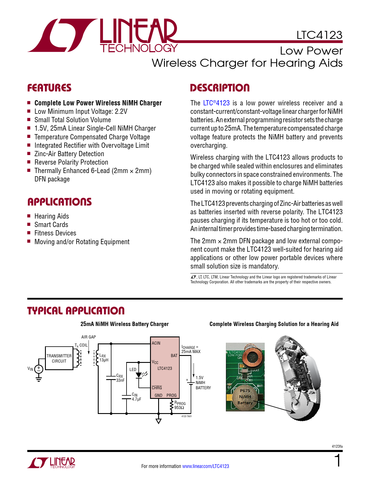 The LTC4123 prevents charging of Zinc-Air batteries as well as batteries inserted with reverse polarity. The LTC4123 n Hearing Aids pauses charging if its temperature is too hot or too cold. n Smart Cards An internal timer provides time-based charging termination. n Fitness Devices n Moving and/or Rotating Equipment The 2mm × 2mm DFN package and low external compo- nent count make the LTC4123 well-suited for hearing aid applications or other low power portable devices where small solution size is mandatory. L, LT, LTC, LTM, Linear Technology and the Linear logo are registered trademarks of Linear Technology Corporation. All other trademarks are the property of their respective owners.