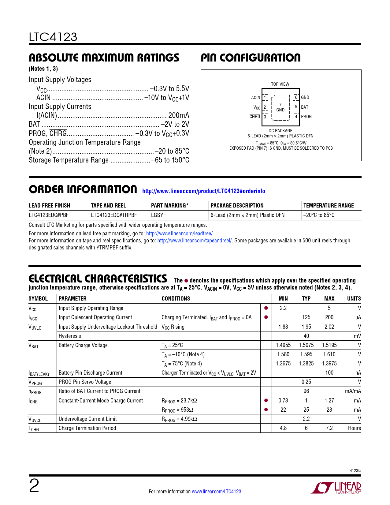 orDer inForMaTion http://www.linear.com/product/LTC4123#orderinfo LEAD FREE FINISH TAPE AND REEL PART MARKING* PACKAGE DESCRIPTION TEMPERATURE RANGE