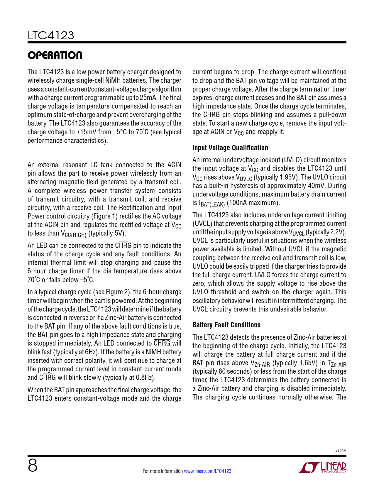 The LTC4123 is a low power battery charger designed to current begins to drop. The charge current will continue wirelessly charge single-cell NiMH batteries. The charger to drop and the BAT pin voltage will be maintained at the uses a constant-current/constant-voltage charge algorithm proper charge voltage. After the charge termination timer with a charge current programmable up to 25mA. The final expires, charge current ceases and the BAT pin assumes a charge voltage is temperature compensated to reach an high impedance state. Once the charge cycle terminates, optimum state-of-charge and prevent overcharging of the the CHRG pin stops blinking and assumes a pull-down battery. The LTC4123 also guarantees the accuracy of the state. To start a new charge cycle, remove the input volt- charge voltage to ±15mV from –5°C to 70˚C (see typical age at ACIN or VCC and reapply it. performance characteristics).
