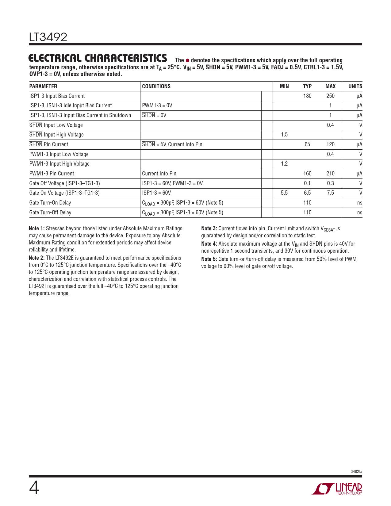 Gate turn-on/turn-off delay is measured from 50% level of PWM from 0°C to 125°C junction temperature. Specifi cations over the –40°C voltage to 90% level of gate on/off voltage. to 125°C operating junction temperature range are assured by design, characterization and correlation with statistical process controls. The LT3492I is guaranteed over the full –40°C to 125°C operating junction temperature range. 3492fa 4