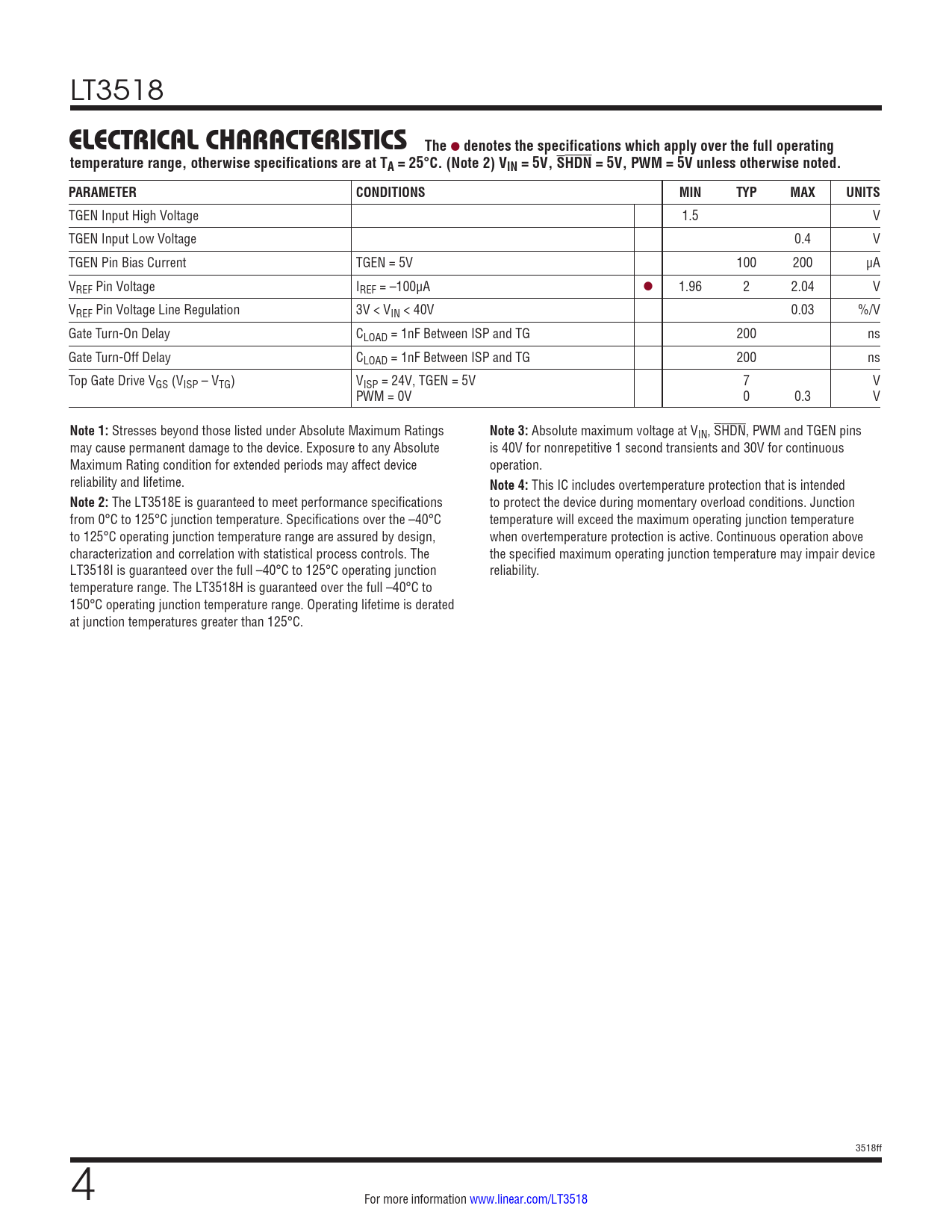 The LT3518E is guaranteed to meet performance specifications to protect the device during momentary overload conditions. Junction from 0°C to 125°C junction temperature. Specifications over the –40°C temperature will exceed the maximum operating junction temperature to 125°C operating junction temperature range are assured by design, when overtemperature protection is active. Continuous operation above characterization and correlation with statistical process controls. The the specified maximum operating junction temperature may impair device LT3518I is guaranteed over the full –40°C to 125°C operating junction reliability. temperature range. The LT3518H is guaranteed over the full –40°C to 150°C operating junction temperature range. Operating lifetime is derated at junction temperatures greater than 125°C. 3518ff 4 For more information www.linear.com/LT3518 Document Outline Features Applications Typical Application Description Absolute Maximum Ratings Pin Configuration Order Information Electrical Characteristics Typical Performance Characteristics Pin Functions Block Diagram Operation Applications Information Typical Applications Package Description Revision History Typical Application Related Parts