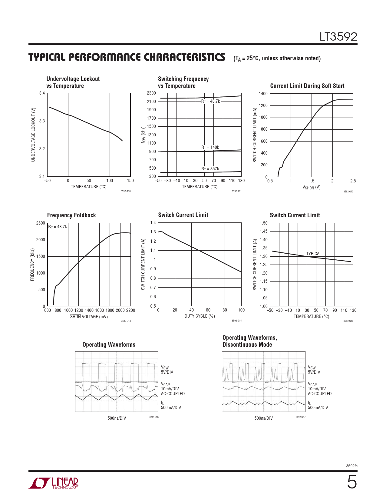 3.4 2300 1400 2100 RT = 48.7k 1200 1900 1700 1000 3.3 1500 800 (kHz) 1300 TAGE LOCKOUT (V) f SW 1100 600 VOL 3.2 RT = 140k 900 400 UNDER 700 SWITCH CURRENT LIMIT (mA) 200 500 RT = 357k 3.1 300 0 –50 0 50 100 150 –50 –30 –10 10 30 50 70 90 110 130 0.5 1 1.5 2 2.5 TEMPERATURE (°C) TEMPERATURE (°C) VSHDN (V) 3592 G10 3592 G11 3592 G12