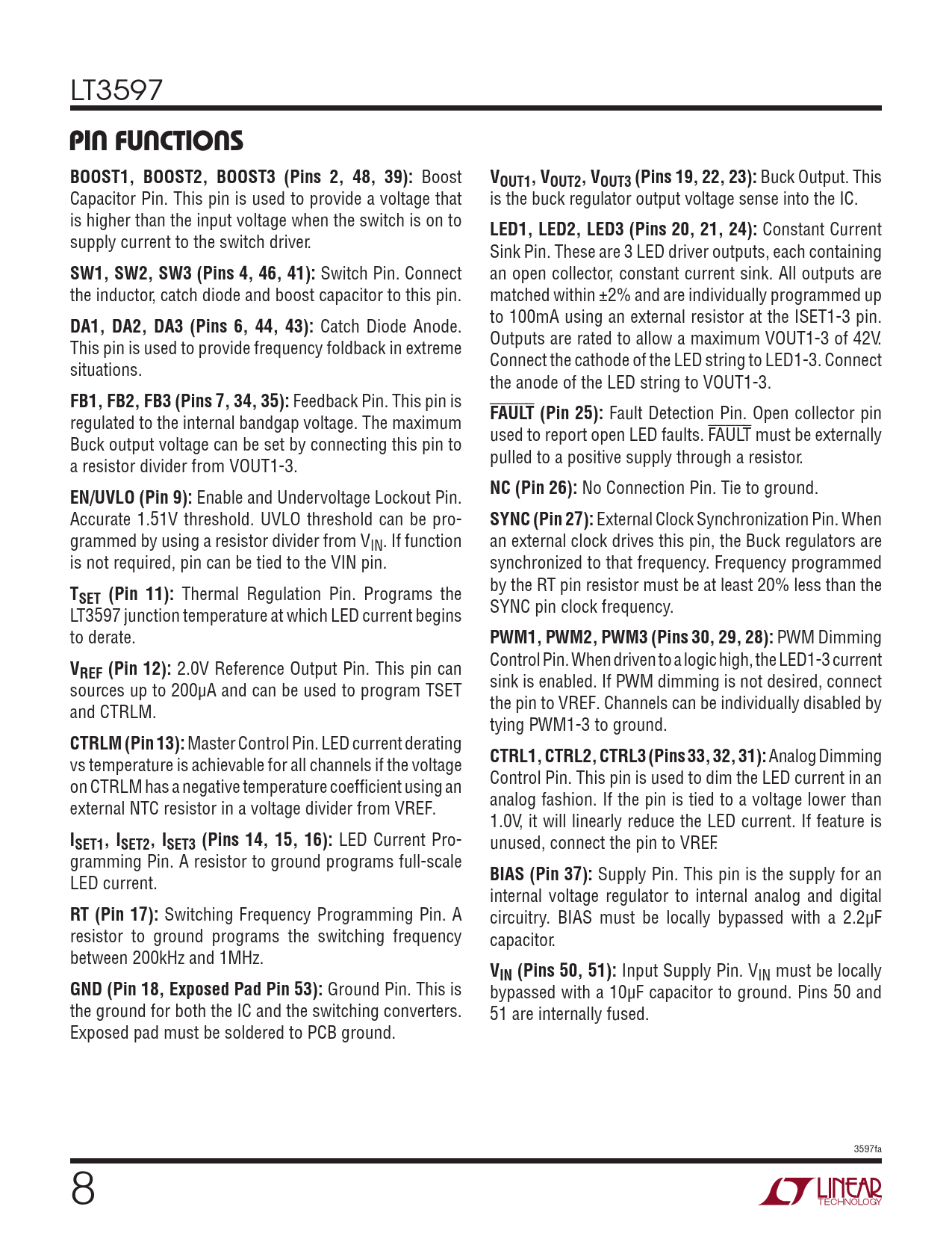 pin FuncTions. BOOST1, BOOST2, BOOST3 (Pins 2, 48, 39):. VOUT1, VOUT2, VOUT3 (Pins 19, 22, 23):
