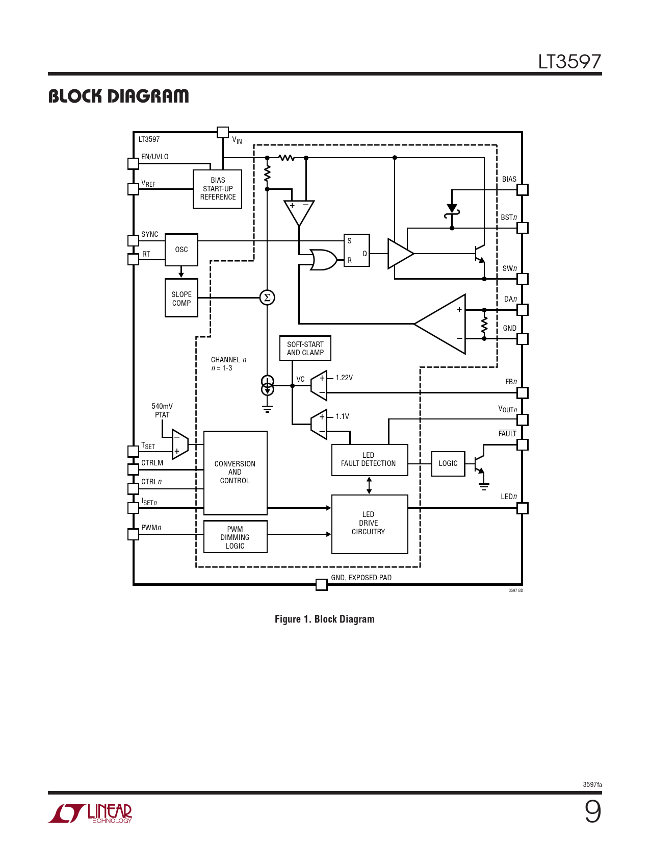 LT3597 VIN EN/UVLO BIAS V BIAS REF START-UP REFERENCE + – BSTn SYNC S OSC RT Q R SWn SLOPE COMP DAn + GND – SOFT-START AND CLAMP CHANNEL n n = 1-3 VC + 1.22V FBn – 540mV VOUTn PTAT + 1.1V – – FAULT TSET + LED CTRLM CONVERSION FAULT DETECTION LOGIC AND CTRLn CONTROL I LEDn SETn LED DRIVE PWMn PWM CIRCUITRY DIMMING LOGIC GND, EXPOSED PAD 3597 BD