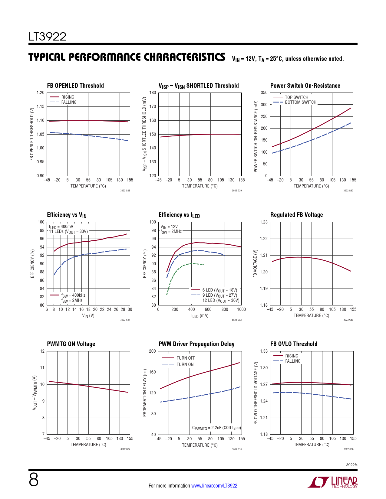 12 200 1.33 TURN OFF RISING FALLING TURN ON 11 1.30 160 TAGE (V) (V) Y (ns) 10 1.27 PWMTG 120 – V TION DELA 9 1.24 AGA V OUT 80 8 PROP 1.21 FB OVLO THRESHOLD VOL CPWMTG = 2.2nF (C0G type) 7 40 1.18 –45 –20 5 30 55 80 105 130 155 –45 –20 5 30 55 80 105 130 155 –45 –20 5 30 55 80 105 130 155 TEMPERATURE (°C) TEMPERATURE (°C) TEMPERATURE (°C) 3922 G34 3922 G35 3922 G36 3922fa 8 For more information www.linear.com/LT3922 Document Outline Features Description Applications Typical Application Absolute Maximum Ratings Pin Configuration Order Information Electrical Characteristics Typical Performance Characteristics Pin Functions Block Diagram Operation Applications Information Typical Applications Package Description Revision History Typical Application Related Parts