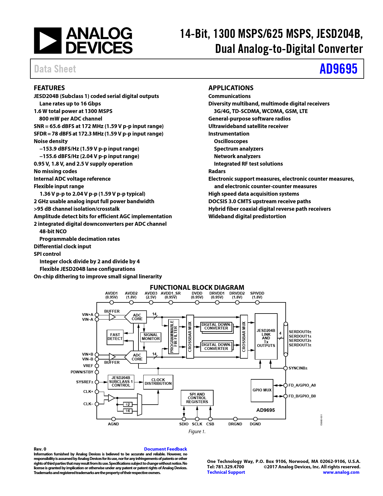 14-Bit, 1300 MSPS/625 MSPS, JESD204B,. Dual Analog-to-Digital Converter. Data Sheet. AD9695. FEATURES. APPLICATIONS