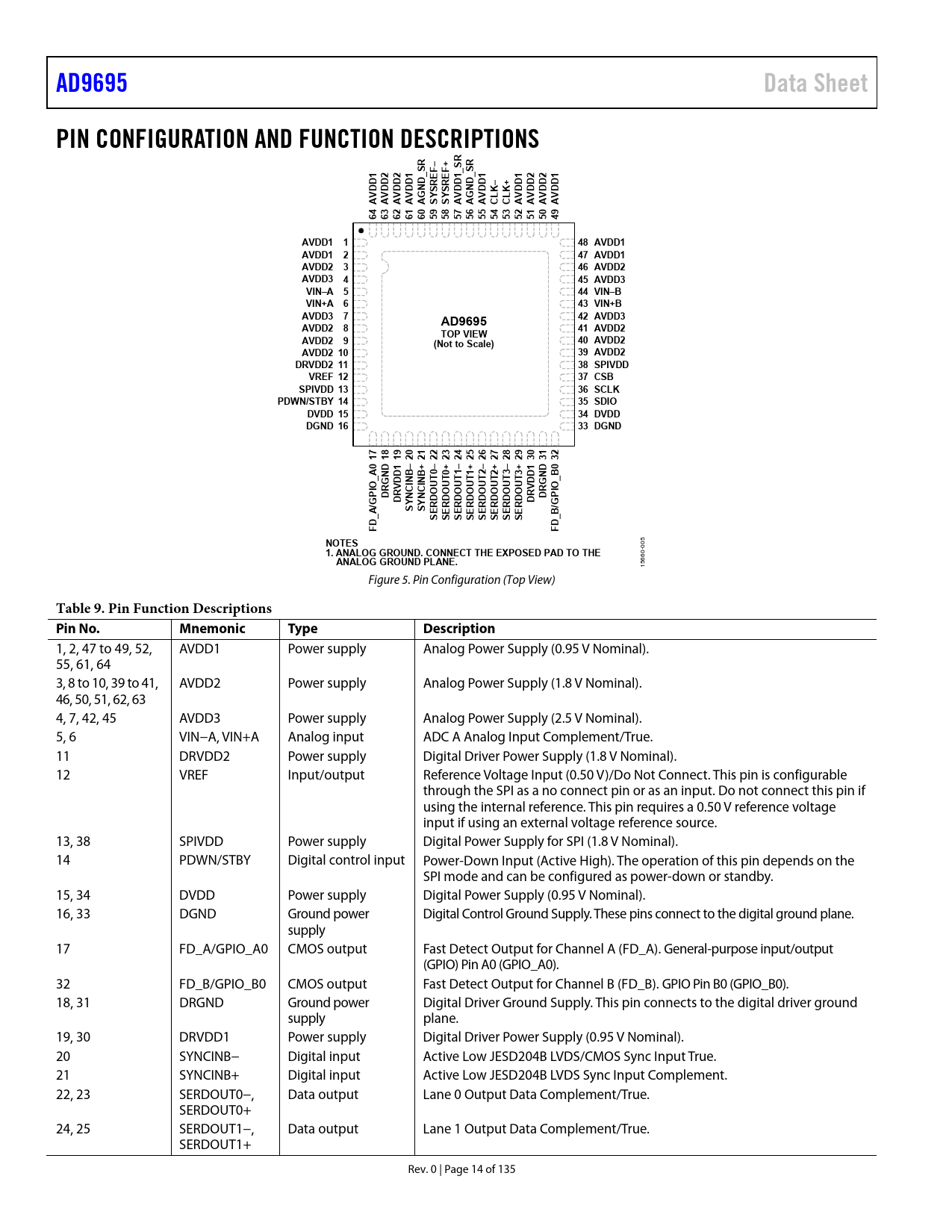 AD9695. Data Sheet. PIN CONFIGURATION AND FUNCTION DESCRIPTIONS. DD1. DD2. YSR. AVDD1 1. 48 AVDD1. AVDD1 2. 47 AVDD1. AVDD2 3. 46 AVDD2