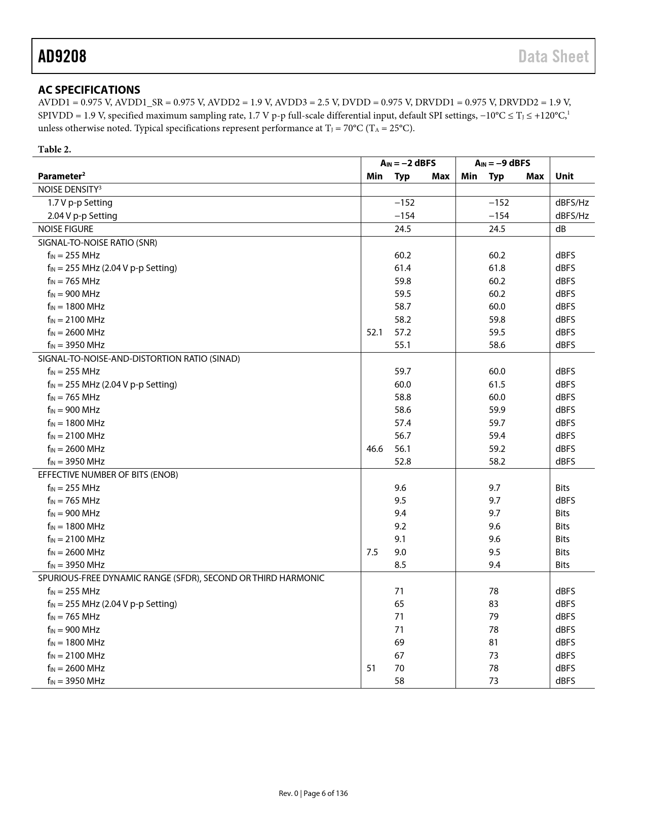 AD9208. Data Sheet. AC SPECIFICATIONS. Table 2. AIN = −2 dBFS. AIN = −9 dBFS. Parameter2. Min. Typ Max. Unit