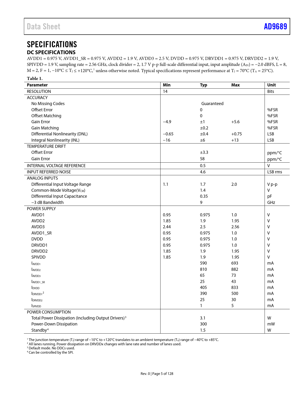 Data Sheet AD9689 SPECIFICATIONS DC SPECIFICATIONS Table 1 Parameter Min Typ Max Unit