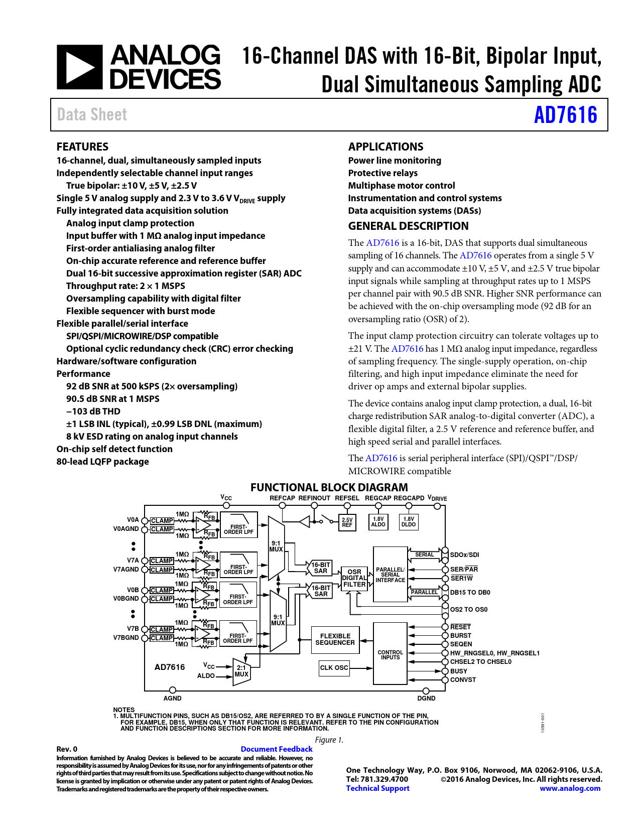16-Channel DAS with 16-Bit, Bipolar Input,. Dual Simultaneous Sampling ADC. Data Sheet. AD7616. FEATURES. APPLICATIONS