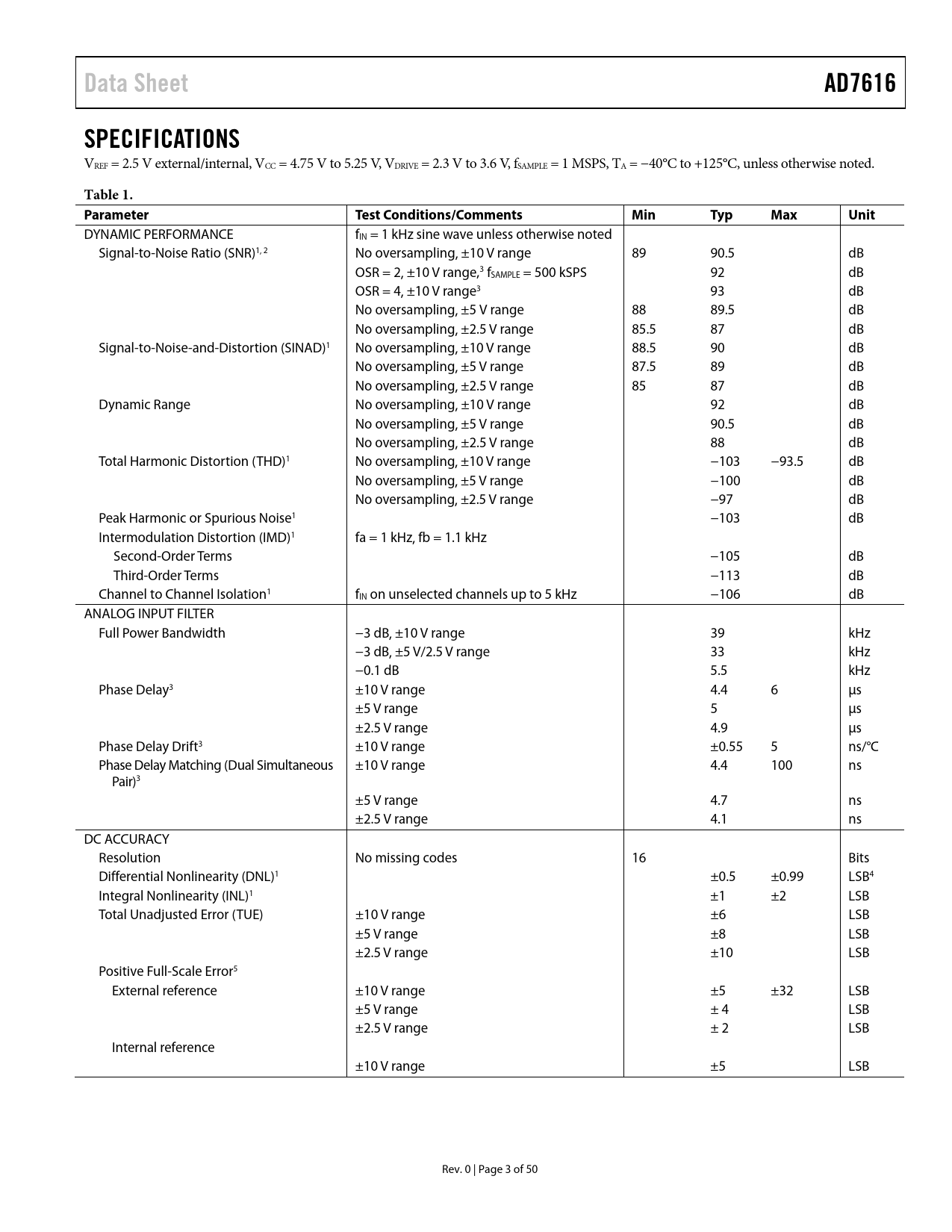 Data Sheet AD7616 SPECIFICATIONS Table 1 Parameter Test Conditions/Comments Min Typ Max Unit