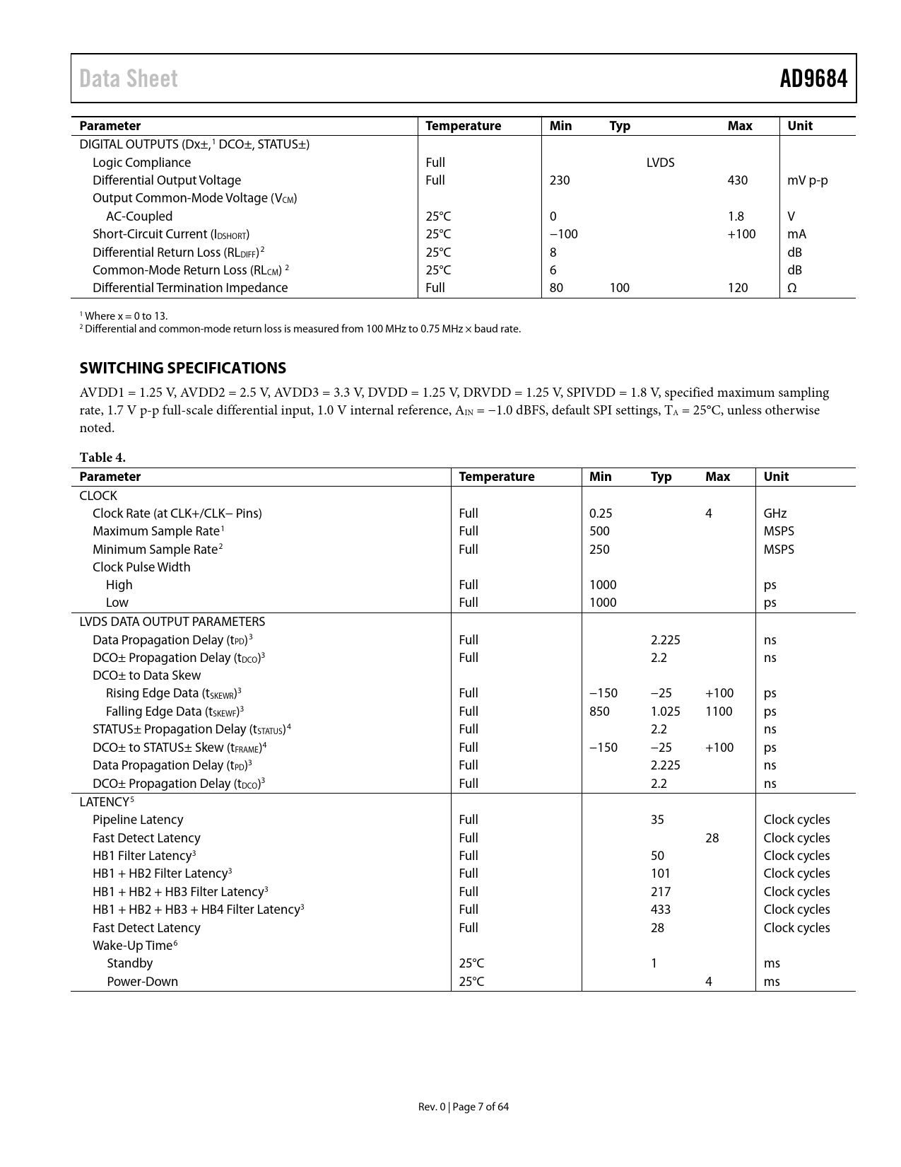 Data Sheet AD9684 Parameter Temperature Min Typ Max Unit SWITCHING SPECIFICATIONS Table 4 Parameter