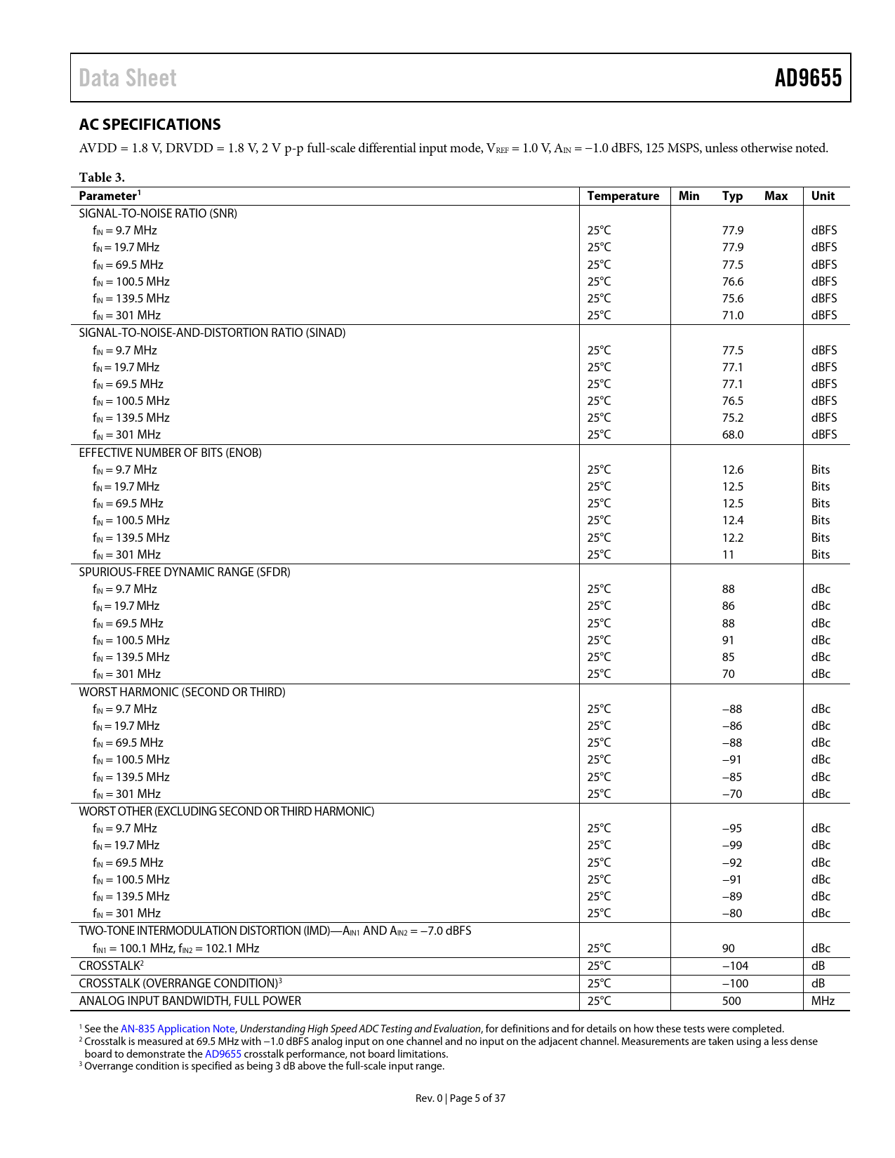Data Sheet AD9655 AC SPECIFICATIONS Table 3 Parameter1 Temperature Min Typ Max Unit