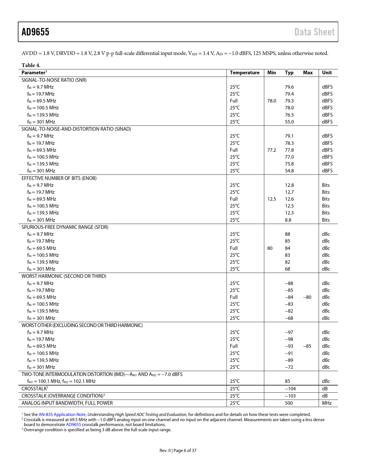 Páginas / Página38 / 7 — AD9655. Data Sheet. Table 4. Parameter1. Temperature. Min. Typ. Max. Unit