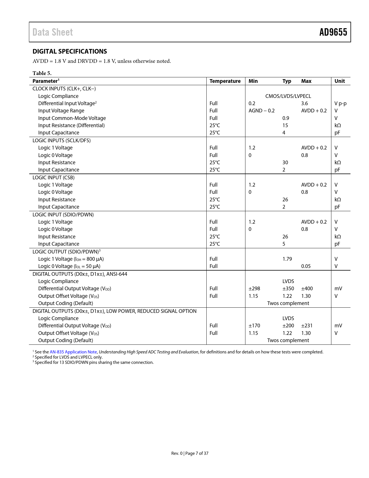 Data Sheet. AD9655. DIGITAL SPECIFICATIONS. Table 5. Parameter1. Temperature. Min. Typ. Max. Unit