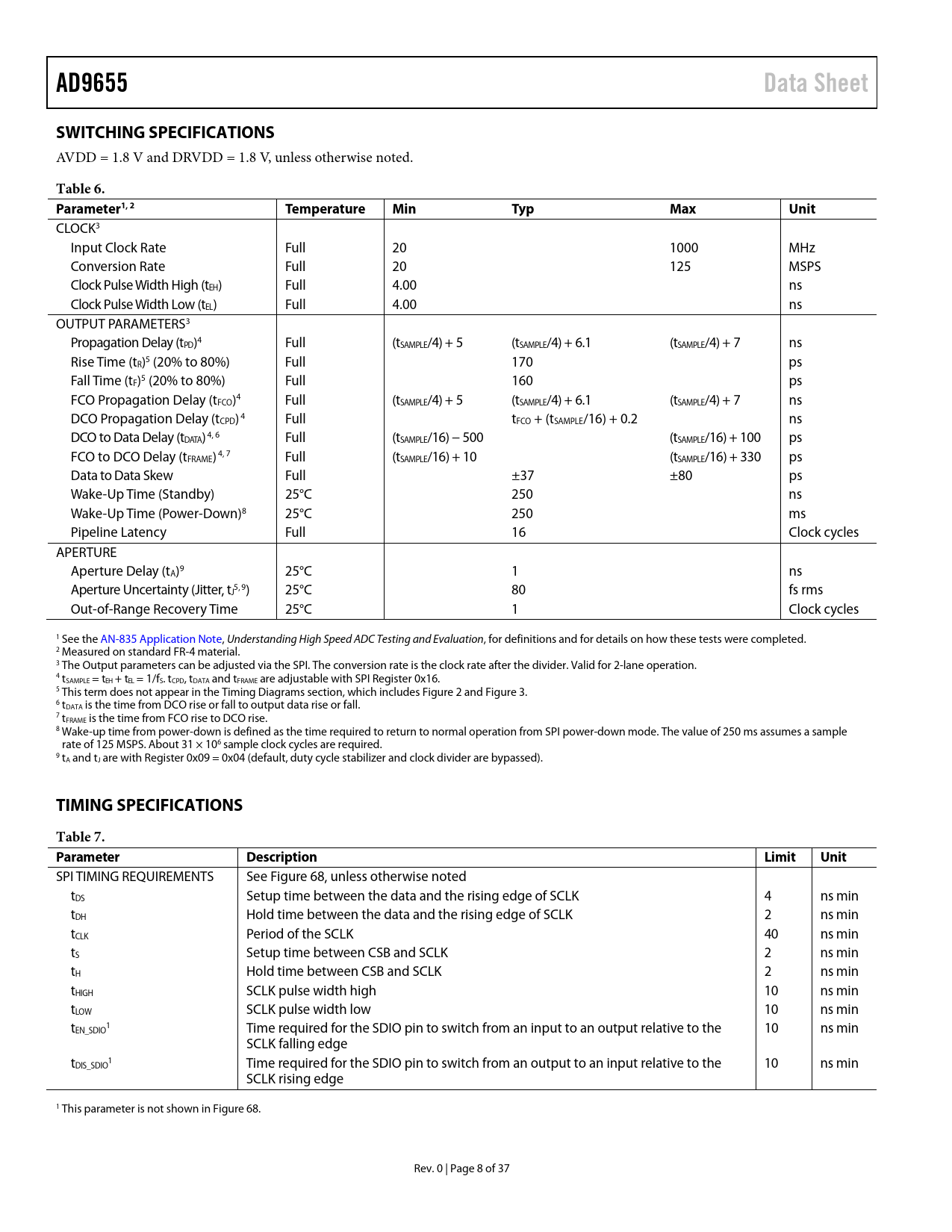 Páginas / Página38 / 9 — AD9655. Data Sheet. SWITCHING SPECIFICATIONS. Table 6. Parameter1, 2. …