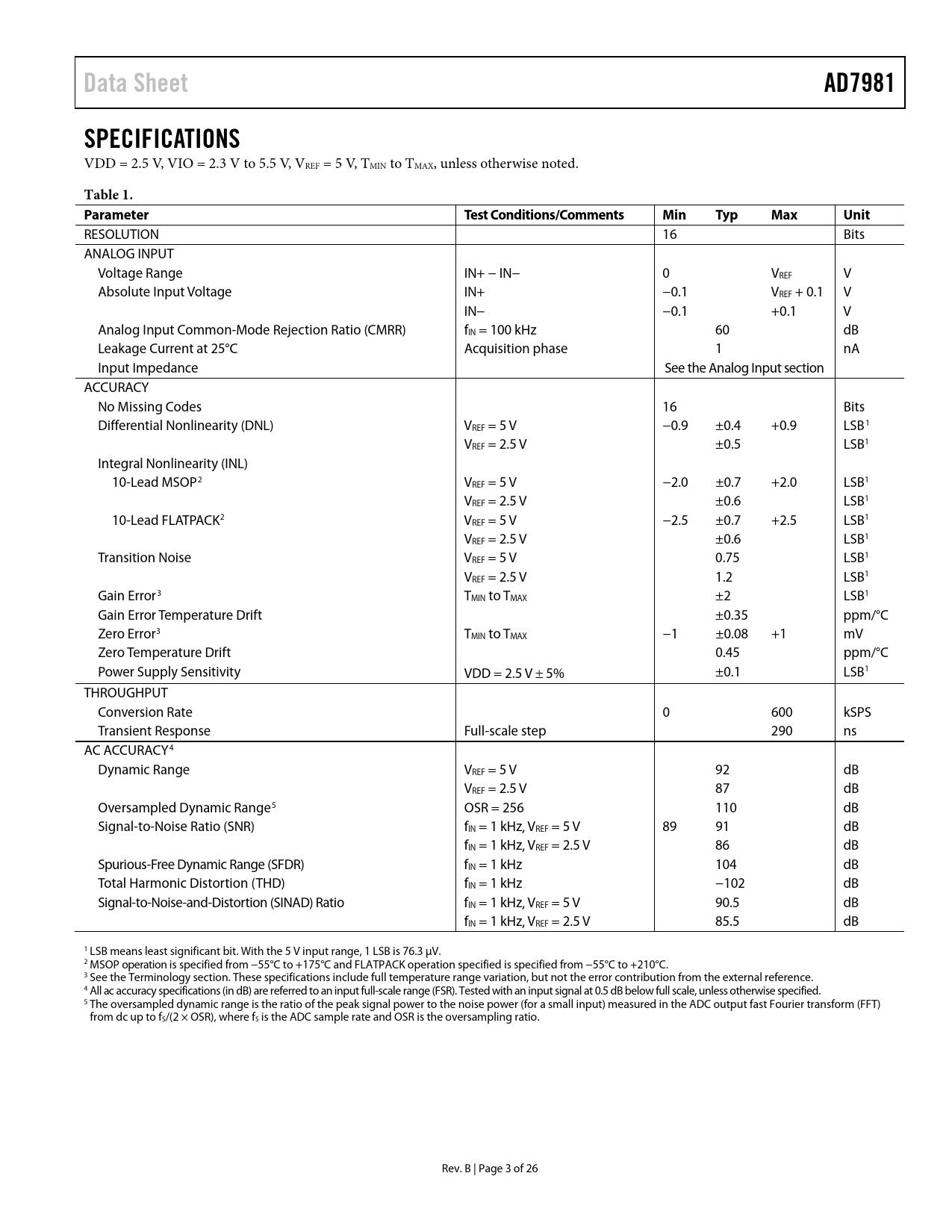 link to page 16 link to page 13 Data SheetAD7981SPECIFICATIONS VDD = 2.5 V, VIO = 2.3 V to 5.5 V, VREF = 5 V, TMIN to TMAX, unless otherwise noted. Table 1. ParameterTest Conditions/CommentsMinTypMaxUnit RESOLUTION 16 Bits ANALOG INPUT Voltage Range IN+ − IN− 0 VREF V Absolute Input Voltage IN+ −0.1 VREF + 0.1 V IN− −0.1 +0.1 V Analog Input Common-Mode Rejection Ratio (CMRR) fIN = 100 kHz 60 dB Leakage Current at 25°C Acquisition phase 1 nA Input Impedance See the Analog Input section ACCURACY No Missing Codes 16 Bits Differential Nonlinearity (DNL) VREF = 5 V −0.9 ±0.4 +0.9 LSB1 VREF = 2.5 V ±0.5 LSB1 Integral Nonlinearity (INL) 10-Lead MSOP2 VREF = 5 V −2.0 ±0.7 +2.0 LSB1 VREF = 2.5 V ±0.6 LSB1 10-Lead FLATPACK2 VREF = 5 V −2.5 ±0.7 +2.5 LSB1 VREF = 2.5 V ±0.6 LSB1 Transition Noise VREF = 5 V 0.75 LSB1 VREF = 2.5 V 1.2 LSB1 Gain Error3 TMIN to TMAX ±2 LSB1 Gain Error Temperature Drift ±0.35 ppm/°C Zero Error3 TMIN to TMAX −1 ±0.08 +1 mV Zero Temperature Drift 0.45 ppm/°C Power Supply Sensitivity VDD = 2.5 V ± 5% ±0.1 LSB1 THROUGHPUT Conversion Rate 0 600 kSPS Transient Response Full-scale step 290 ns AC ACCURACY4 Dynamic Range VREF = 5 V 92 dB VREF = 2.5 V 87 dB Oversampled Dynamic Range5 OSR = 256 110 dB Signal-to-Noise Ratio (SNR) fIN = 1 kHz, VREF = 5 V 89 91 dB fIN = 1 kHz, VREF = 2.5 V 86 dB Spurious-Free Dynamic Range (SFDR) fIN = 1 kHz 104 dB Total Harmonic Distortion (THD) fIN = 1 kHz −102 dB Signal-to-Noise-and-Distortion (SINAD) Ratio fIN = 1 kHz, VREF = 5 V 90.5 dB fIN = 1 kHz, VREF = 2.5 V 85.5 dB 1 LSB means least significant bit. With the 5 V input range, 1 LSB is 76.3 µV. 2 MSOP operation is specified from −55°C to +175°C and FLATPACK operation specified is specified from −55°C to +210°C. 3 See the Terminology section. These specifications include full temperature range variation, but not the error contribution from the external reference. 4 All ac accuracy specifications (in dB) are referred to an input ful -scale range (FSR). Tested with an input signal at 0.5 dB below ful scale, unless otherwise specified. 5 The oversampled dynamic range is the ratio of the peak signal power to the noise power (for a small input) measured in the ADC output fast Fourier transform (FFT) from dc up to fS/(2 × OSR), where fS is the ADC sample rate and OSR is the oversampling ratio. Rev. B | Page 3 of 26 Document Outline FEATURES APPLICATIONS TYPICAL APPLICATION CIRCUIT GENERAL DESCRIPTION REVISION HISTORY SPECIFICATIONS TIMING SPECIFICATIONS ABSOLUTE MAXIMUM RATINGS ESD CAUTION PIN CONFIGURATION AND FUNCTION DESCRIPTIONS TYPICAL PERFORMANCE CHARACTERISTICS TERMINOLOGY THEORY OF OPERATION CIRCUIT INFORMATION CONVERTER OPERATION Transfer Functions TYPICAL CONNECTION DIAGRAM ANALOG INPUT DRIVER AMPLIFIER CHOICE VOLTAGE REFERENCE INPUT POWER SUPPLY DIGITAL INTERFACE \CS MODE, 3-WIRE WITHOUT A BUSY INDICATOR \CS MODE, 3-WIRE WITH A BUSY INDICATOR \CS MODE, 4-WIRE WITHOUT A BUSY INDICATOR \CS MODE, 4-WIRE WITH A BUSY INDICATOR CHAIN MODE WITHOUT A BUSY INDICATOR CHAIN MODE WITH A BUSY INDICATOR APPLICATIONS INFORMATION PRINTED CIRCUIT BOARD (PCB) LAYOUT OUTLINE DIMENSIONS ORDERING GUIDE