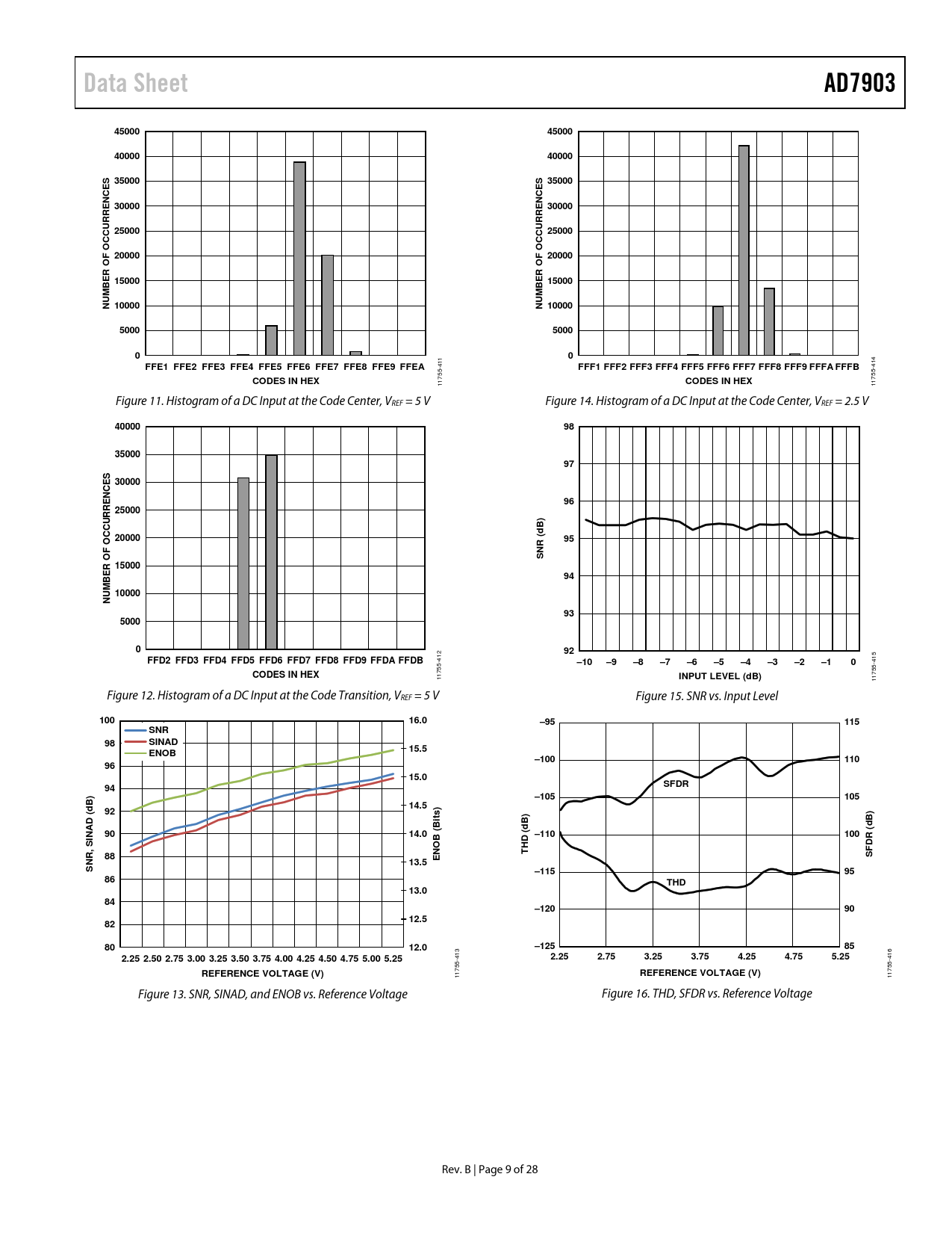 1755- 1 Figure 12. Histogram of a DC Input at the Code Transition, VREF = 5 V Figure 15. SNR vs. Input Level