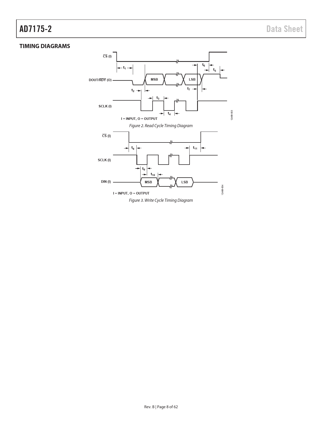 TIMING DIAGRAMS. CS (I). DOUT/RDY (O). MSB. LSB. SCLK (I). I = INPUT, O = OUTPUT. t10. DIN (I)