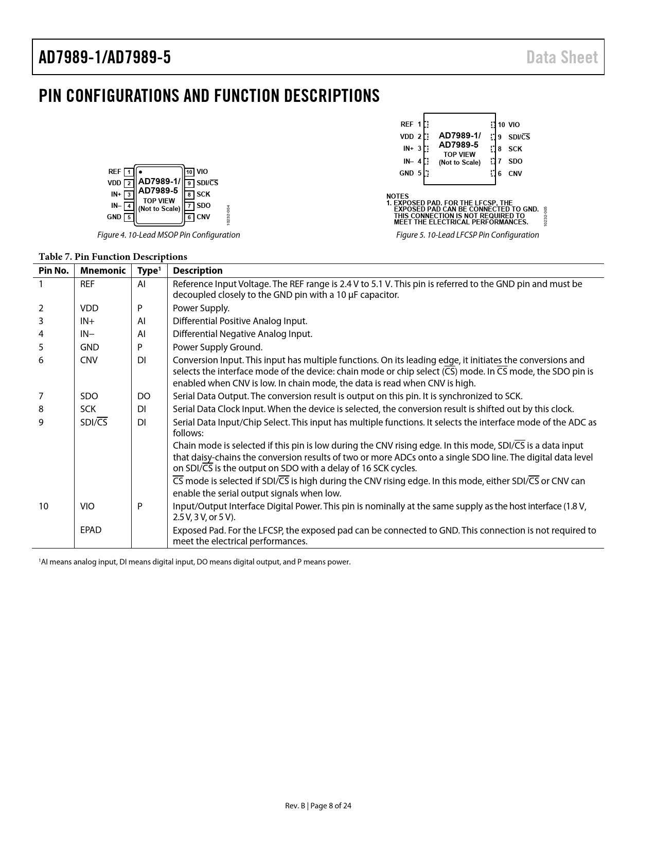 AD7989-1/AD7989-5. Data Sheet. PIN CONFIGURATIONS AND FUNCTION DESCRIPTIONS. REF 1. 10 VIO. VDD 2. AD7989-1/. 9 SDI/CS. AD7989-5. IN+ 3