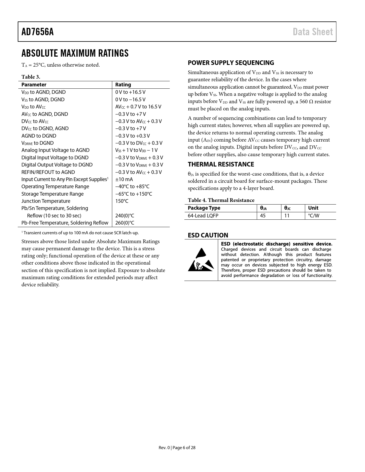 link to page 7 AD7656AData SheetABSOLUTE MAXIMUM RATINGS T POWER SUPPLY SEQUENCING A = 25°C, unless otherwise noted. Simultaneous application of V Table 3. DD and VSS is necessary to guarantee reliability of the device. In the cases where ParameterRating simultaneous application cannot be guaranteed, VDD must power VDD to AGND, DGND 0 V to +16.5 V up before VSS. When a negative voltage is applied to the analog VSS to AGND, DGND 0 V to −16.5 V inputs before VDD and VSS are ful y powered up, a 560 Ω resistor VDD to AVCC AVCC + 0.7 V to 16.5 V must be placed on the analog inputs. AVCC to AGND, DGND −0.3 V to +7 V DV A number of sequencing combinations can lead to temporary CC to AVCC −0.3 V to AVCC + 0.3 V DV high current states; however, when all supplies are powered up, CC to DGND, AGND −0.3 V to +7 V AGND to DGND −0.3 V to +0.3 V the device returns to normal operating currents. The analog V input (AIN) coming before AVCC causes temporary high current DRIVE to DGND −0.3 V to DVCC + 0.3 V Analog Input Voltage to AGND V on the analog inputs. Digital inputs before DVCC, and DVCC SS + 1 V to VDD − 1 V Digital Input Voltage to DGND −0.3 V to V before other supplies, also cause temporary high current states. DRIVE + 0.3 V Digital Output Voltage to DGND −0.3 V to VDRIVE + 0.3 V THERMAL RESISTANCE REFIN/REFOUT to AGND −0.3 V to AVCC + 0.3 V θJA is specified for the worst-case conditions, that is, a device Input Current to Any Pin Except Supplies1 ±10 mA soldered in a circuit board for surface-mount packages. These Operating Temperature Range −40°C to +85°C specifications apply to a 4-layer board. Storage Temperature Range −65°C to +150°C Junction Temperature 150°C Table 4. Thermal Resistance Pb/Sn Temperature, Soldering Package TypeθJAθJCUnit Reflow (10 sec to 30 sec) 240(0)°C 64-Lead LQFP 45 11 °C/W Pb-Free Temperature, Soldering Reflow 260(0)°C 1 Transient currents of up to 100 mA do not cause SCR latch-up. ESD CAUTION Stresses above those listed under Absolute Maximum Ratings may cause permanent damage to the device. This is a stress rating only; functional operation of the device at these or any other conditions above those indicated in the operational section of this specification is not implied. Exposure to absolute maximum rating conditions for extended periods may affect device reliability. Rev. 0 | Page 6 of 28 Document Outline FEATURES APPLICATIONS FUNCTIONAL BLOCK DIAGRAM GENERAL DESCRIPTION PRODUCT HIGHLIGHTS TABLE OF CONTENTS REVISION HISTORY SPECIFICATIONS TIMING SPECIFICATIONS ABSOLUTE MAXIMUM RATINGS POWER SUPPLY SEQUENCING THERMAL RESISTANCE ESD CAUTION PIN CONFIGURATION AND FUNCTION DESCRIPTIONS TYPICAL PERFORMANCE CHARACTERISTICS TERMINOLOGY THEORY OF OPERATION CONVERTER DETAILS Track-and-Hold Amplifiers Analog Input ADC TRANSFER FUNCTION REFERENCE SECTION TYPICAL CONNECTION DIAGRAM DRIVING THE ANALOG INPUTS INTERFACE SECTION Parallel Interface (SER/PAR/SEL = 0) SOFTWARE SELECTION OF ADCS Changing the Analog Input Range (H/S SEL = 0) Changing the Analog Input Range (H/S SEL = 1) Serial Interface (SER/PAR/SEL = 1) SERIAL READ OPERATION DAISY-CHAIN MODE (DCEN = 1, SER//SEL = 1) Standby/Partial Power-Down Modes of Operation (SER/PAR/SEL = 0 or SER/PAR/SEL = 1) APPLICATION HINTS LAYOUT OUTLINE DIMENSIONS ORDERING GUIDE