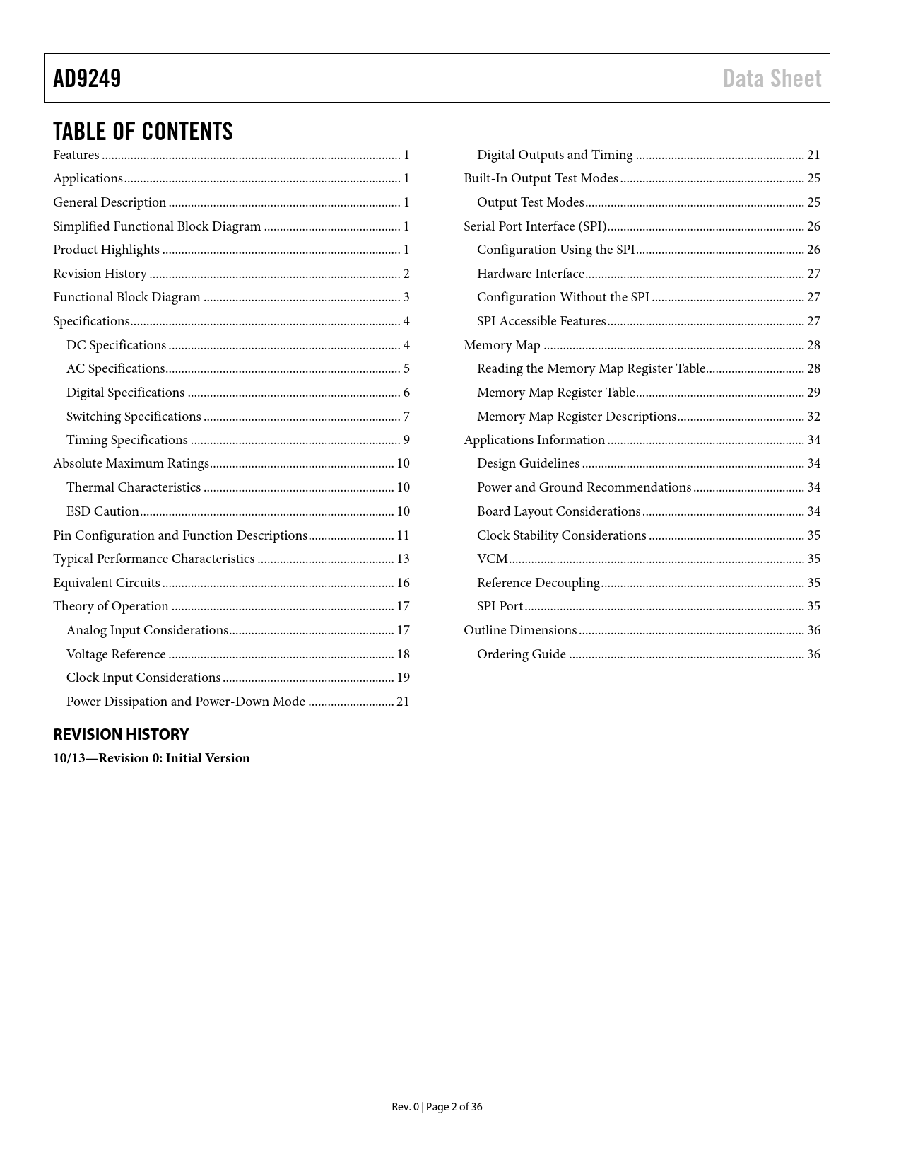 Páginas / Página37 / 3 — AD9249. Data Sheet. TABLE OF CONTENTS. REVISION HISTORY 10/13—Revision 0: …