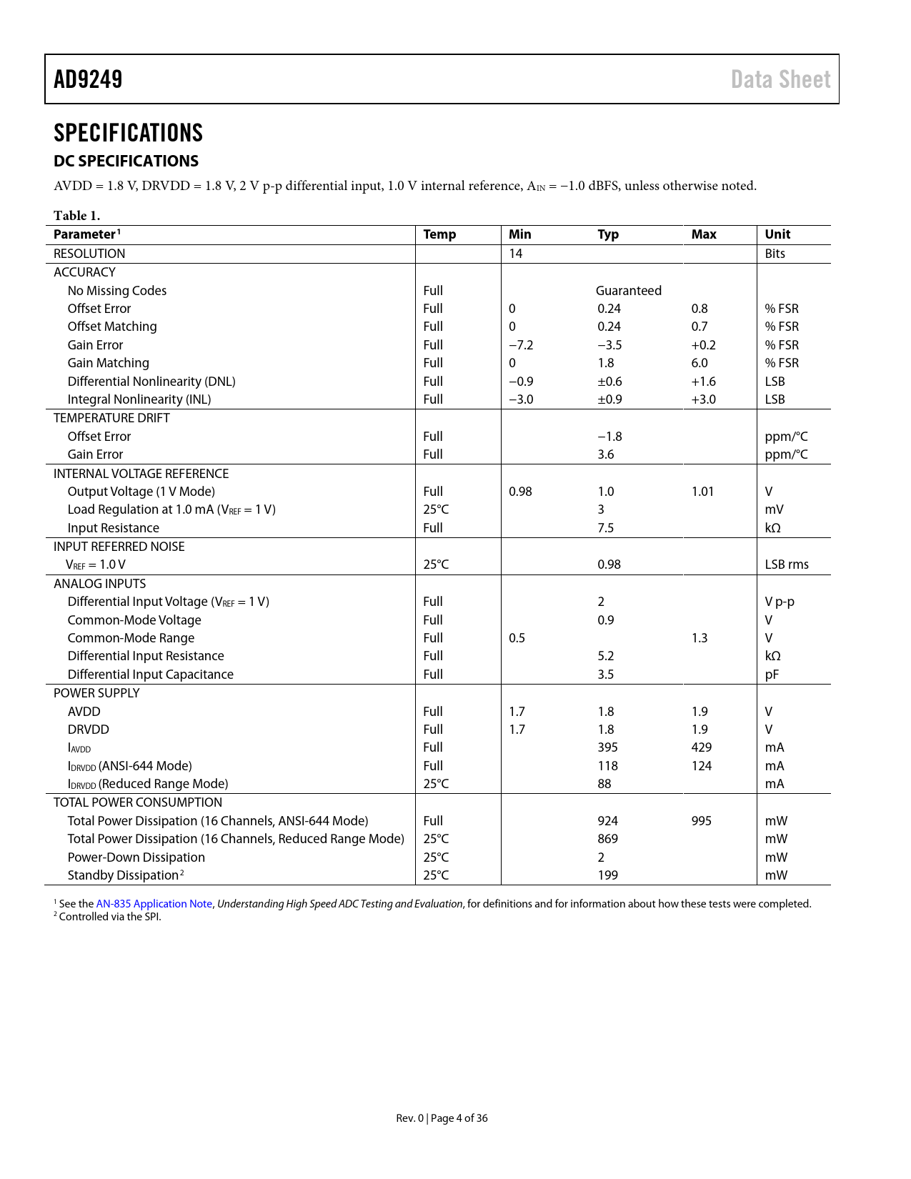 AD9249 Data Sheet SPECIFICATIONS DC SPECIFICATIONS Table 1 Parameter1 Temp Min Typ Max Unit
