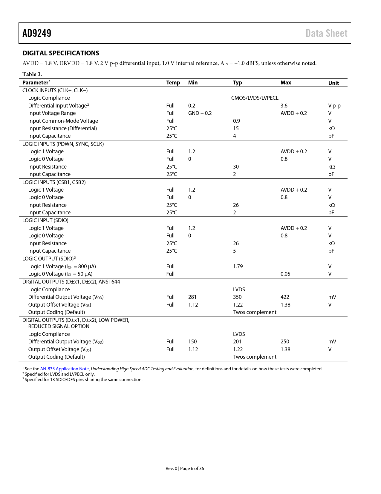 AD9249 Data Sheet DIGITAL SPECIFICATIONS Table 3 Parameter1 Temp Min Typ Max Unit