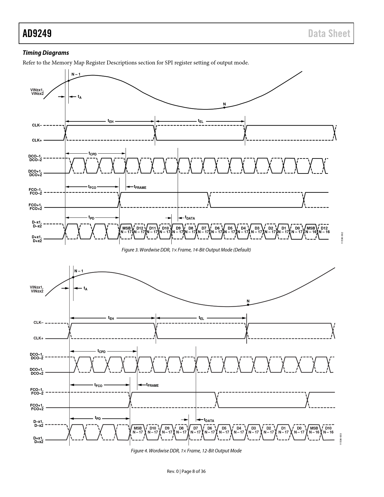 AD9249. Data Sheet. Timing Diagrams. N – 1. VIN±x1,. VIN±x2. tEH. tEL. CLK–. CLK+. tCPD. DCO–1,. DCO–2. DCO+1,. DCO+2. tFCO. tFRAME. FCO–1,. FCO–2. FCO+1,