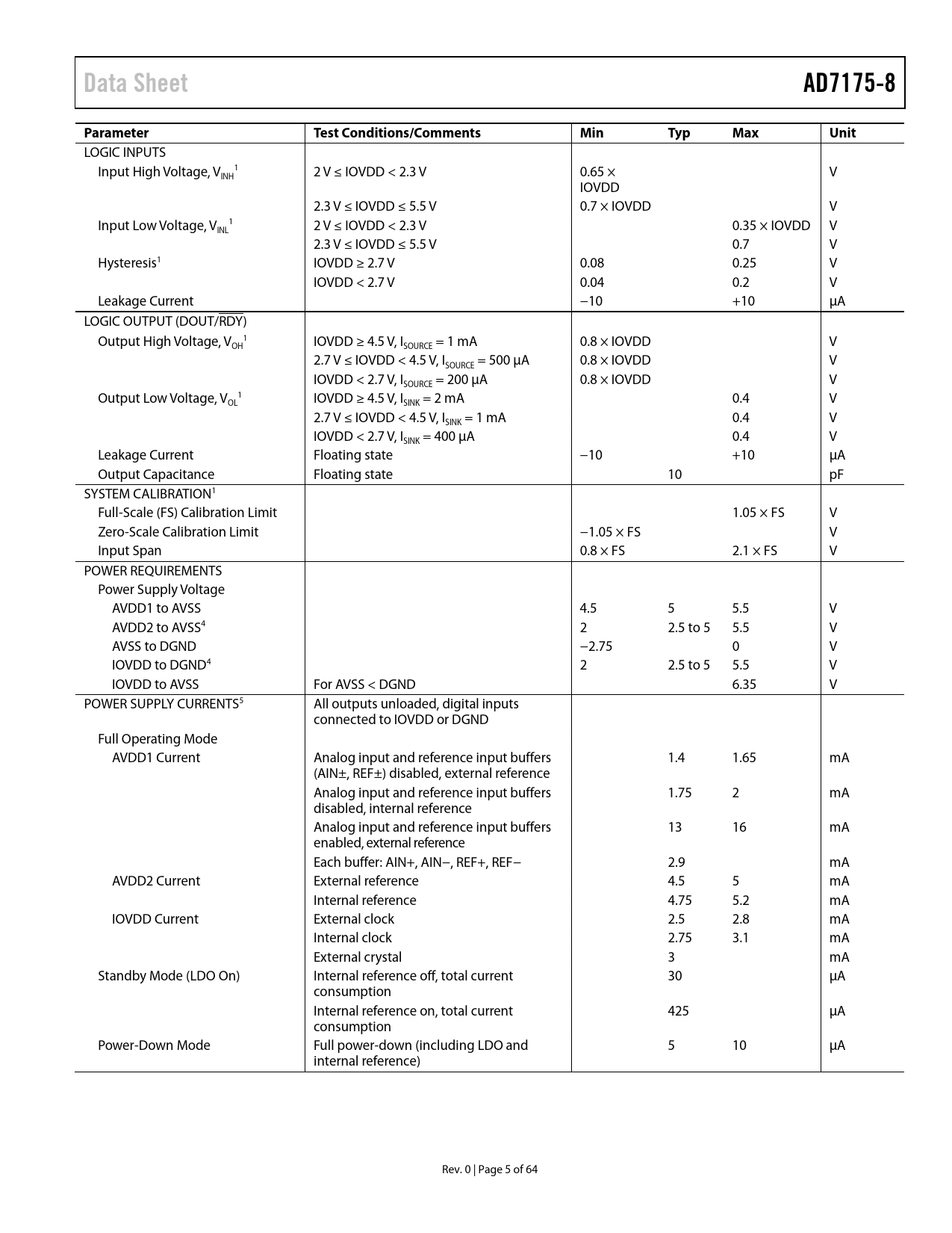 Data Sheet. AD7175-8. Parameter. Test Conditions/Comments. Min. Typ. Max. Unit