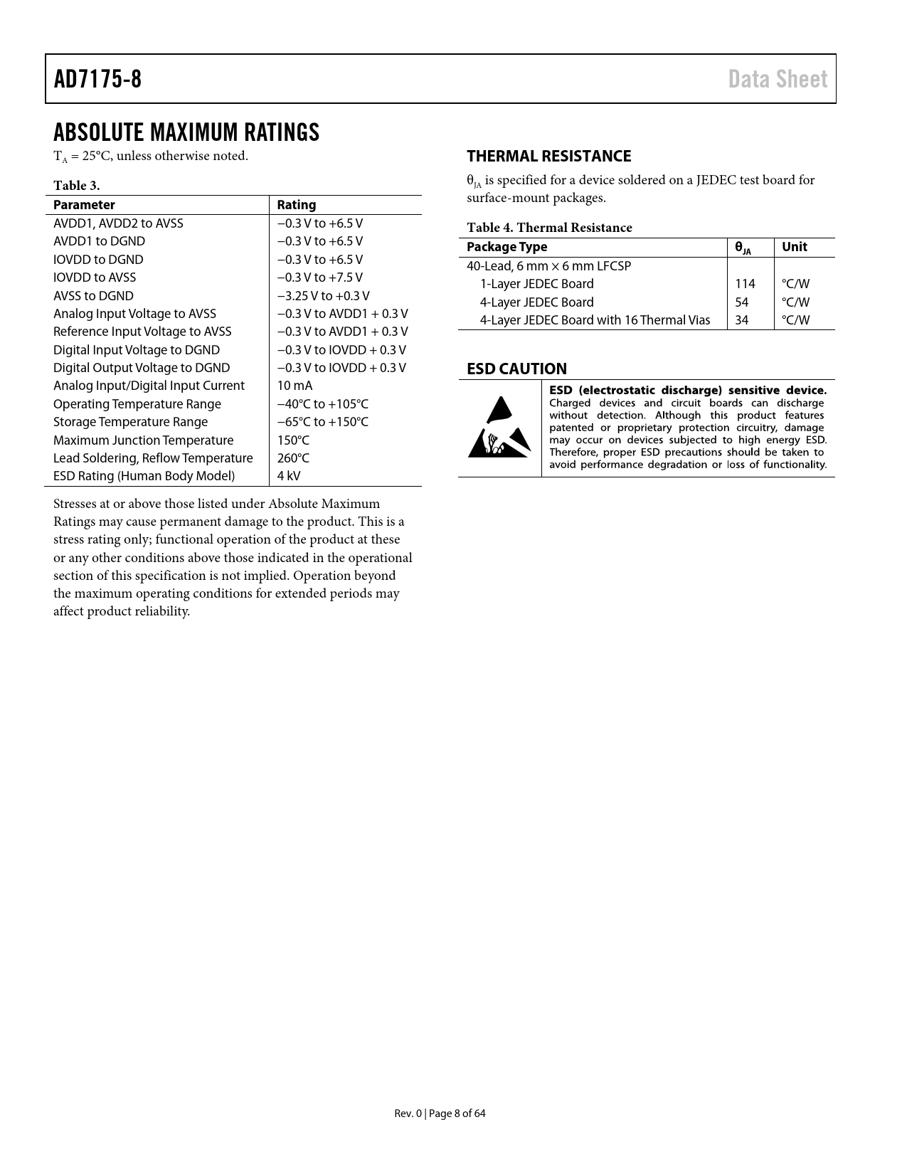 AD7175-8. Data Sheet. ABSOLUTE MAXIMUM RATINGS. THERMAL RESISTANCE. Table 3. Parameter. Rating. Table 4. Thermal Resistance