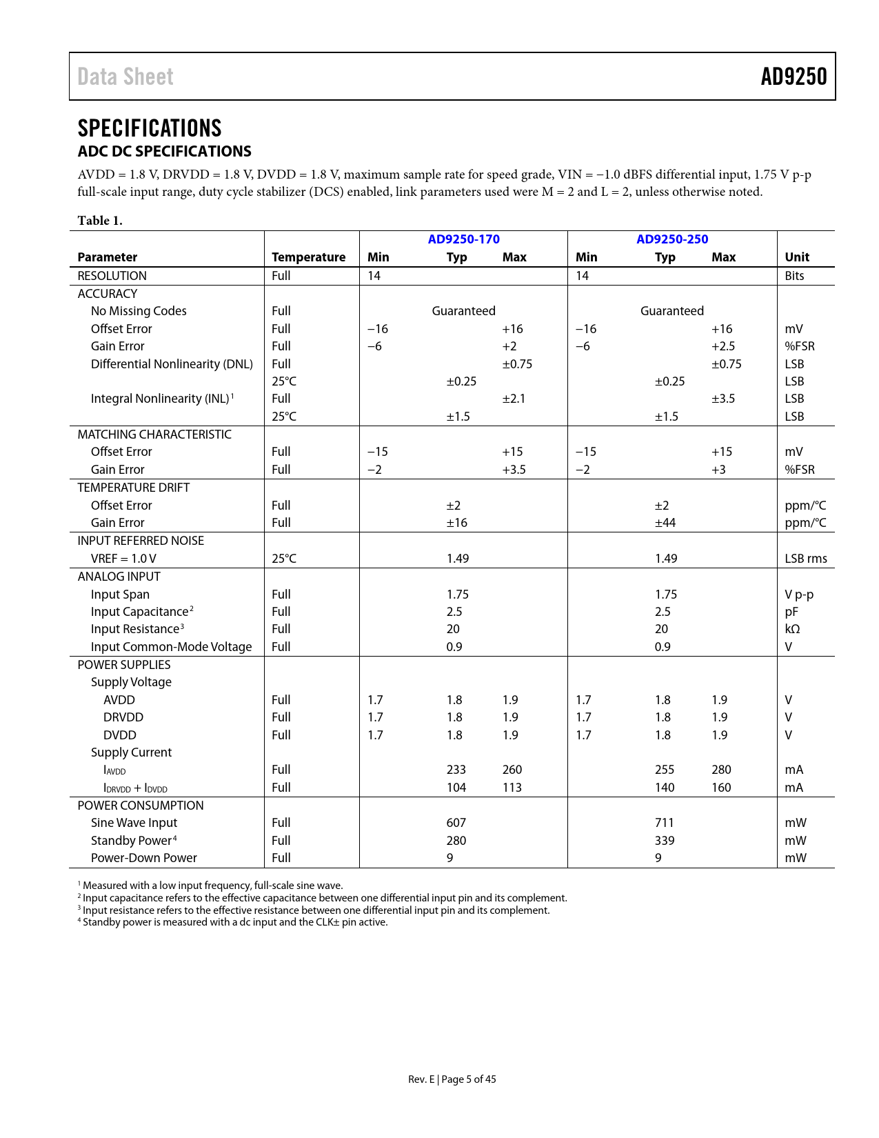 Páginas / Página45 / 5 — Data Sheet. AD9250. SPECIFICATIONS ADC DC SPECIFICATIONS. Table 1. …