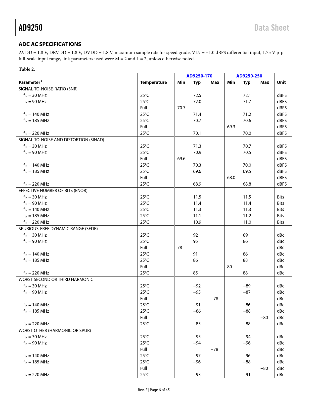 | Páginas / Página | 45 / 6 — AD9250. Data Sheet. ADC AC SPECIFICATIONS. Table 2. AD9250-170. … |