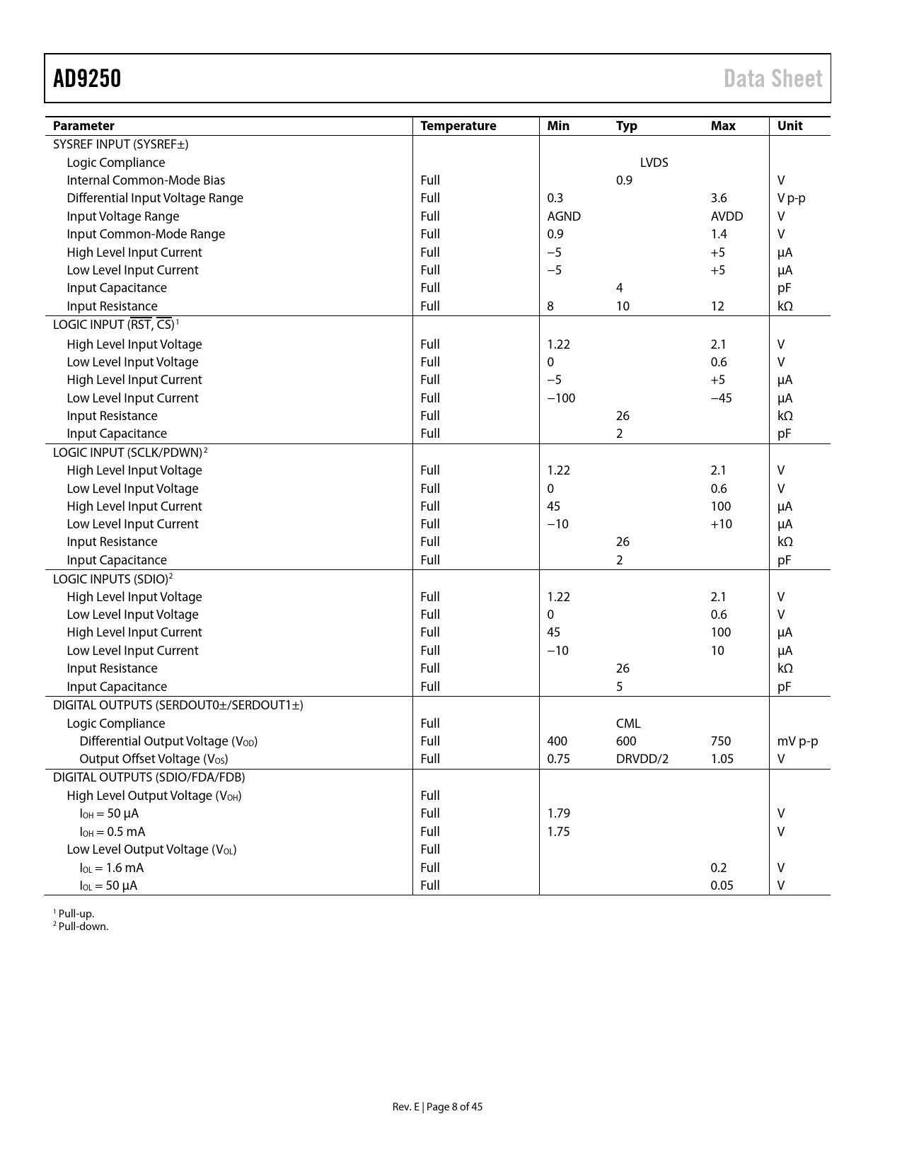 AD9250Data SheetParameterTemperatureMinTypMaxUnit SYSREF INPUT (SYSREF±) Logic Compliance LVDS Internal Common-Mode Bias Full 0.9 V Differential Input Voltage Range Full 0.3 3.6 V p-p Input Voltage Range Full AGND AVDD V Input Common-Mode Range Full 0.9 1.4 V High Level Input Current Full −5 +5 µA Low Level Input Current Full −5 +5 µA Input Capacitance Full 4 pF Input Resistance Full 8 10 12 kΩ LOGIC INPUT (RST, CS)1 High Level Input Voltage Full 1.22 2.1 V Low Level Input Voltage Full 0 0.6 V High Level Input Current Full −5 +5 µA Low Level Input Current Full −100 −45 µA Input Resistance Full 26 kΩ Input Capacitance Full 2 pF LOGIC INPUT (SCLK/PDWN)2 High Level Input Voltage Full 1.22 2.1 V Low Level Input Voltage Full 0 0.6 V High Level Input Current Full 45 100 µA Low Level Input Current Full −10 +10 µA Input Resistance Full 26 kΩ Input Capacitance Full 2 pF LOGIC INPUTS (SDIO)2 High Level Input Voltage Full 1.22 2.1 V Low Level Input Voltage Full 0 0.6 V High Level Input Current Full 45 100 µA Low Level Input Current Full −10 10 µA Input Resistance Full 26 kΩ Input Capacitance Full 5 pF DIGITAL OUTPUTS (SERDOUT0±/SERDOUT1±) Logic Compliance Full CML Differential Output Voltage (VOD) Full 400 600 750 mV p-p Output Offset Voltage (VOS) Full 0.75 DRVDD/2 1.05 V DIGITAL OUTPUTS (SDIO/FDA/FDB) High Level Output Voltage (VOH) Full IOH = 50 µA Full 1.79 V IOH = 0.5 mA Full 1.75 V Low Level Output Voltage (VOL) Full IOL = 1.6 mA Full 0.2 V IOL = 50 µA Full 0.05 V 1 Pull-up. 2 Pull-down. Rev. E | Page 8 of 45 Document Outline Features Applications Functional Block Diagram Product Highlights Revision History General Description Specifications ADC DC Specifications ADC AC Specifications Digital Specifications Switching Specifications Timing Specifications Timing Diagrams Absolute Maximum Ratings Thermal Characteristics ESD Caution Pin Configuration and Function Descriptions Typical Performance Characteristics Equivalent Circuits Theory of Operation ADC Architecture Analog Input Considerations Input Common Mode Differential Input Configurations Voltage Reference Clock Input Considerations Nyquist Clock Input Options RF Clock Input Options Input Clock Divider Clock Duty Cycle Jitter Considerations Power Dissipation and Standby Mode Digital Outputs JESD204B Transmit Top Level Description JESD204B Overview JESD204B Synchronization Details CGS Phase ILAS Phase Data Transmission Phase Link Setup Parameters Disable Lanes Before Changing Configuration Select Quick Configuration Option Configure Detailed Options Check FCHK, Checksum of JESD204B Interface Parameters Additional Digital Output Configuration Options Re-Enable Lanes After Configuration Internal FIFO Timing Optimization Frame and Lane Alignment Monitoring and Correction Digital Outputs and Timing ADC Overrange and Gain Control ADC Overrange (OR) Gain Switching Fast Threshold Detection (FDA and FDB) DC Correction DC Correction Bandwidth DC Correction Readback DC Correction Freeze DC Correction (DCC) Enable Bits Serial Port Interface (SPI) Configuration Using the SPI Hardware Interface SPI Accessible Features Memory Map Reading the Memory Map Register Table Open and Reserved Locations Default Values Logic Levels Channel-Specific Registers Memory Map Register Table Memory Map Register Description Applications Information Design Guidelines Power and Ground Recommendations Exposed Paddle Thermal Heat Slug Recommendations VCM SPI Port SPI Initialization Sequence Outline Dimensions Ordering Guide