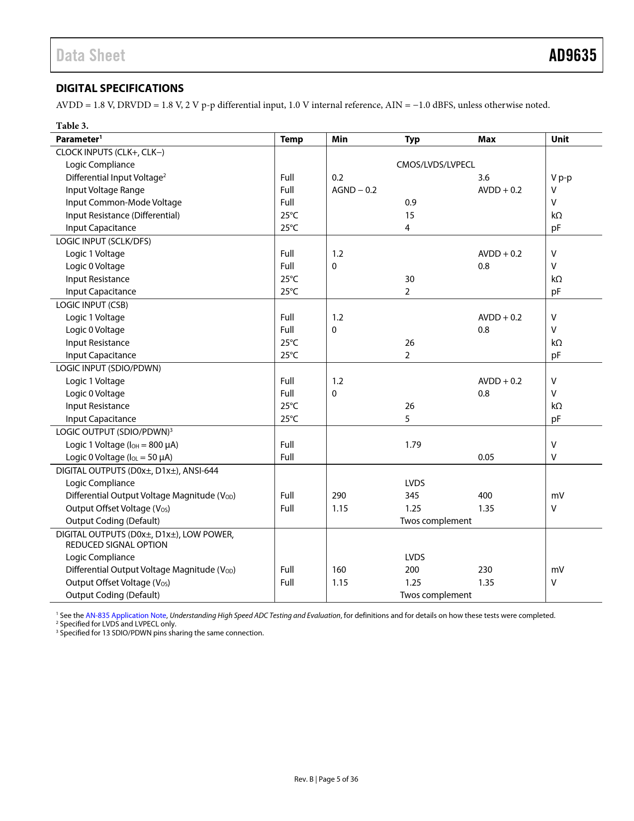 Data Sheet AD9635 DIGITAL SPECIFICATIONS Table 3 Parameter1 Temp Min Typ Max Unit
