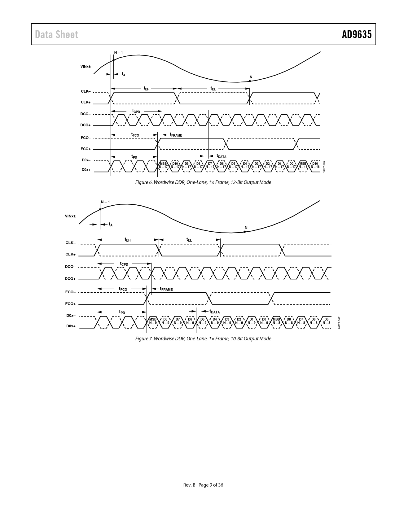 Data Sheet. AD9635. N – 1. VINx±. tEH. tEL. CLK–. CLK+. tCPD. DCO–. DCO+. tFCO. tFRAME. FCO–. FCO+. tDATA. D0x–. MSB. D10. N – 17. N – 17 N – 17. N – 16. D0x+. N – 9