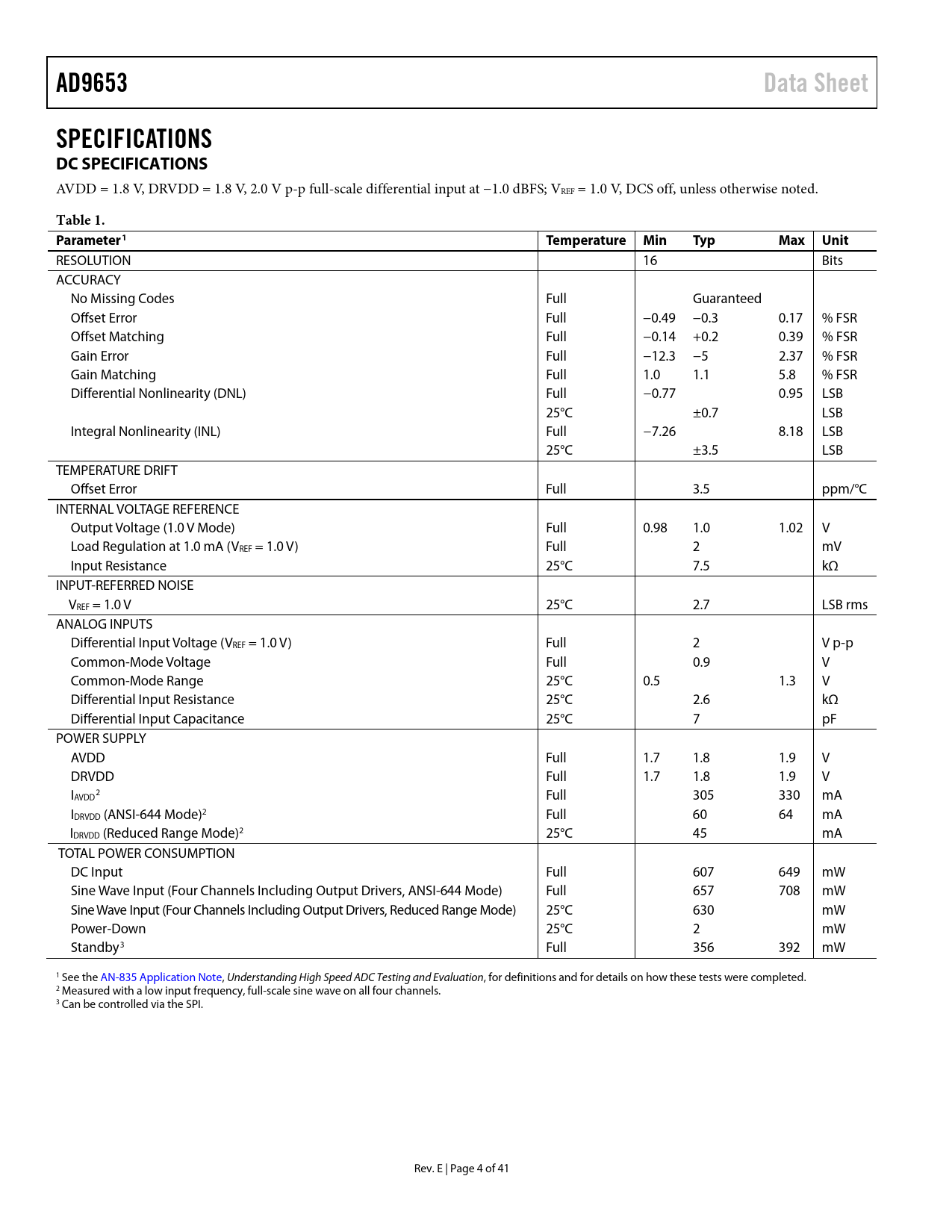 AD9653Data SheetSPECIFICATIONS DC SPECIFICATIONS AVDD = 1.8 V, DRVDD = 1.8 V, 2.0 V p-p ful -scale differential input at −1.0 dBFS; VREF = 1.0 V, DCS off, unless otherwise noted. Table 1. Parameter1Temperature MinTypMax Unit RESOLUTION 16 Bits ACCURACY No Missing Codes Full Guaranteed Offset Error Full −0.49 −0.3 0.17 % FSR Offset Matching Full −0.14 +0.2 0.39 % FSR Gain Error Full −12.3 −5 2.37 % FSR Gain Matching Full 1.0 1.1 5.8 % FSR Differential Nonlinearity (DNL) Full −0.77 0.95 LSB 25°C ±0.7 LSB Integral Nonlinearity (INL) Full −7.26 8.18 LSB 25°C ±3.5 LSB TEMPERATURE DRIFT Offset Error Full 3.5 ppm/°C INTERNAL VOLTAGE REFERENCE Output Voltage (1.0 V Mode) Full 0.98 1.0 1.02 V Load Regulation at 1.0 mA (VREF = 1.0 V) Full 2 mV Input Resistance 25°C 7.5 kΩ INPUT-REFERRED NOISE VREF = 1.0 V 25°C 2.7 LSB rms ANALOG INPUTS Differential Input Voltage (VREF = 1.0 V) Full 2 V p-p Common-Mode Voltage Full 0.9 V Common-Mode Range 25°C 0.5 1.3 V Differential Input Resistance 25°C 2.6 kΩ Differential Input Capacitance 25°C 7 pF POWER SUPPLY AVDD Full 1.7 1.8 1.9 V DRVDD Full 1.7 1.8 1.9 V I 2 AVDD Full 305 330 mA IDRVDD (ANSI-644 Mode)2 Full 60 64 mA IDRVDD (Reduced Range Mode)2 25°C 45 mA TOTAL POWER CONSUMPTION DC Input Full 607 649 mW Sine Wave Input (Four Channels Including Output Drivers, ANSI-644 Mode) Full 657 708 mW Sine Wave Input (Four Channels Including Output Drivers, Reduced Range Mode) 25°C 630 mW Power-Down 25°C 2 mW Standby3 Full 356 392 mW 1 See the AN-835 Application Note, Understanding High Speed ADC Testing and Evaluation, for definitions and for details on how these tests were completed. 2 Measured with a low input frequency, full-scale sine wave on all four channels. 3 Can be controlled via the SPI. Rev. E | Page 4 of 41 Document Outline FEATURES APPLICATIONS GENERAL DESCRIPTION FUNCTIONAL BLOCK DIAGRAM PRODUCT HIGHLIGHTS TABLE OF CONTENTS REVISION HISTORY SPECIFICATIONS DC SPECIFICATIONS AC SPECIFICATIONS DIGITAL SPECIFICATIONS SWITCHING SPECIFICATIONS TIMING SPECIFICATIONS Timing Diagrams ABSOLUTE MAXIMUM RATINGS THERMAL RESISTANCE ESD CAUTION PIN CONFIGURATION AND FUNCTION DESCRIPTIONS TYPICAL PERFORMANCE CHARACTERISTICS VREF = 1.0 V VREF = 1.3 V EQUIVALENT CIRCUITS THEORY OF OPERATION ANALOG INPUT CONSIDERATIONS Input Common Mode Differential Input Configurations VOLTAGE REFERENCE Internal Reference Connection External Reference Operation CLOCK INPUT CONSIDERATIONS Clock Input Options Input Clock Divider Clock Duty Cycle Jitter Considerations POWER DISSIPATION AND POWER-DOWN MODE DIGITAL OUTPUTS AND TIMING SDIO/OLM Pin SCLK/DTP Pin CSB Pin RBIAS Pin OUTPUT TEST MODES SERIAL PORT INTERFACE (SPI) CONFIGURATION USING THE SPI HARDWARE INTERFACE CONFIGURATION WITHOUT THE SPI SPI ACCESSIBLE FEATURES MEMORY MAP READING THE MEMORY MAP REGISTER TABLE Open Locations Default Values Logic Levels Channel-Specific Registers MEMORY MAP REGISTER TABLE MEMORY MAP REGISTER DESCRIPTIONS Device Index (Register 0x04, Register 0x05) Transfer (Register 0xFF) Power Modes (Register 0x08) Bits[7:6]—Open Bit 5—External Power-Down Pin Function Bits[4:2]—Open Bits[1:0]—Power Mode Clock (Register 0x09) Bits[7:1]—Open Bit 0—Duty Cycle Stabilize Enhancement Control (Register 0x0C) Bits[7:3]—Open Bit 2—Chop Mode Bits[1:0]—Open Output Mode (Register 0x14) Bit 7—Open Bit 6—LVDS-ANSI/LVDS-IEEE Option Bits[5:3]—Open Bit 2—Output Invert Bit 1—1 Bit 0—Output Format Output Adjust (Register 0x15) Bits[7:6]—Open Bits[5:4]—Output Driver Termination Bits[3:1]—Open Bit 0—Output Drive Output Phase (Register 0x16) Bit 7—Open Bits[6:4]—Input Clock Phase Adjust Bits[3:0]—Output Clock Phase Adjust Serial Output Data Control (Register 0x21) Sample Rate Override (Register 0x100) User Input/Output Control 2 (Register 0x101) Bits[7:1]—Open Bit 0—SDIO Pull-Down User Input/Output Control 3 (Register 0x102) Bits[7:4]—Open Bit 3—VCM Power-Down Bits[2:0]—Open APPLICATIONS INFORMATION DESIGN GUIDELINES POWER AND GROUND RECOMMENDATIONS CLOCK STABILITY CONSIDERATIONS EXPOSED PAD THERMAL HEAT SLUG RECOMMENDATIONS VCM REFERENCE DECOUPLING SPI PORT CROSSTALK PERFORMANCE OUTLINE DIMENSIONS ORDERING GUIDE
